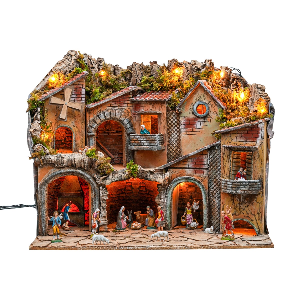 Presepe artigianale illuminato, incluso di statuine Landi Moranduzzo serie 10 cm, dotato di forno e mulino a vento funzionante, alimentato a corrente.