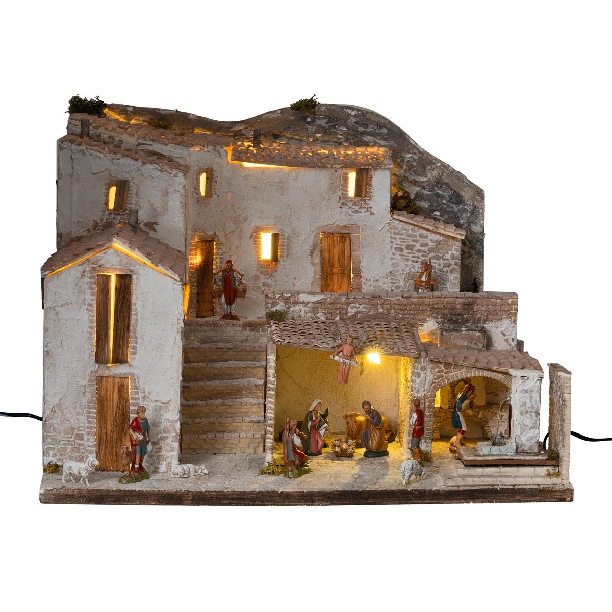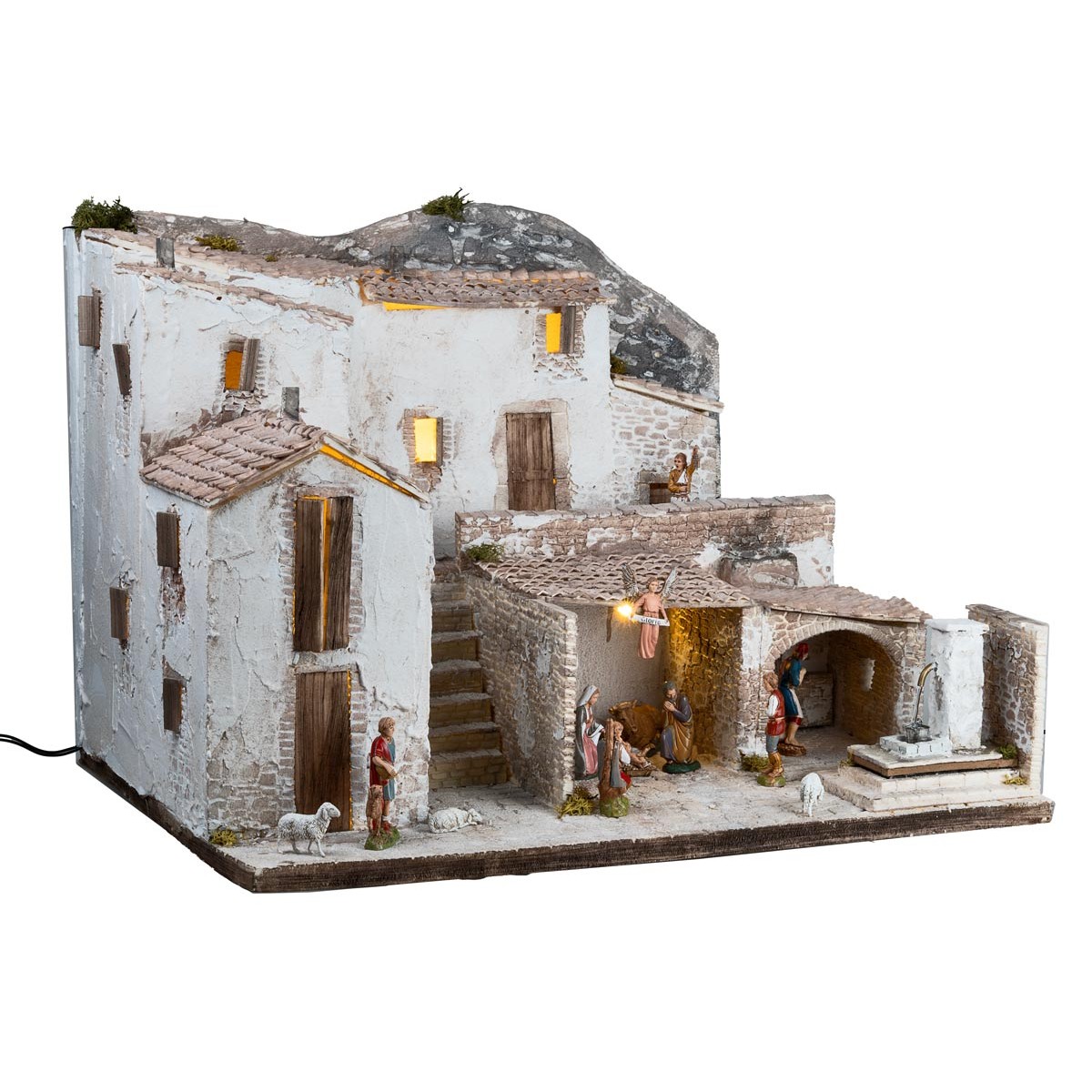 Presepe artigianale illuminato con fontana completa di pompa per il ricircolo dell’acqua funzionante a corrente, completo di statue della serie Landi Moranduzzo da 10 cm.