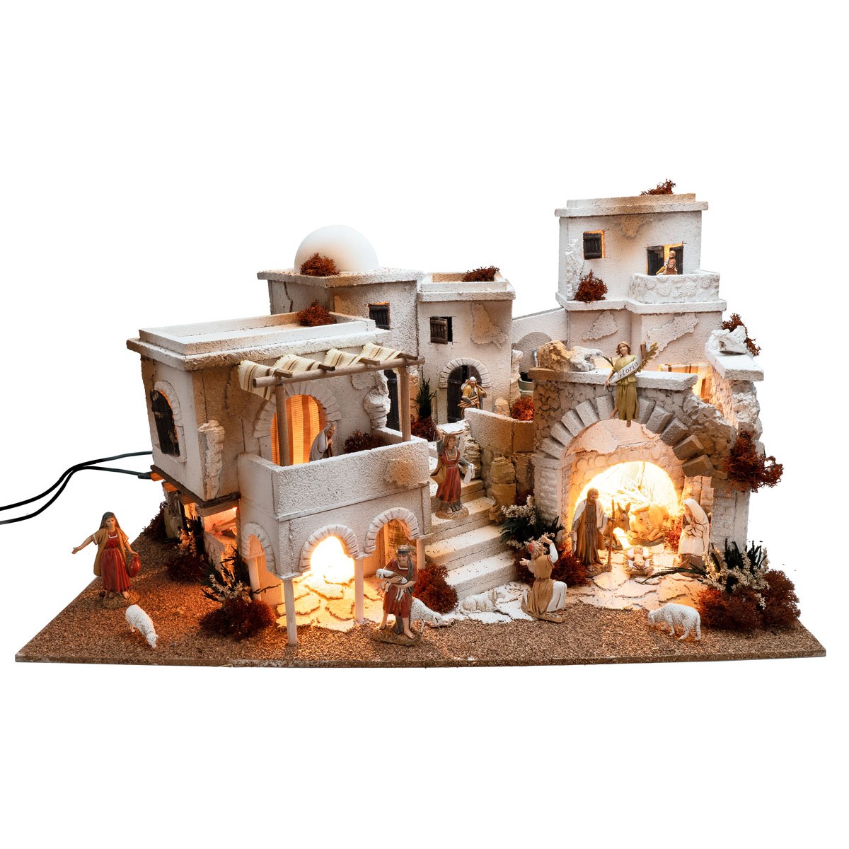 La scenografia si sviluppa su più livelli con case arabe bianche a tetto piatto, terrazze e archi. Sul lato destro si trova un grande arco in pietra con luce effetto fuoco, mentre al centro una scalinata collega i diversi piani con porte e finestre ad arco. È presente anche una fontana funzionante con pompa per il ricircolo dell’acqua.Realizzato artigianalmente in Italia con legno, sughero e muschio.