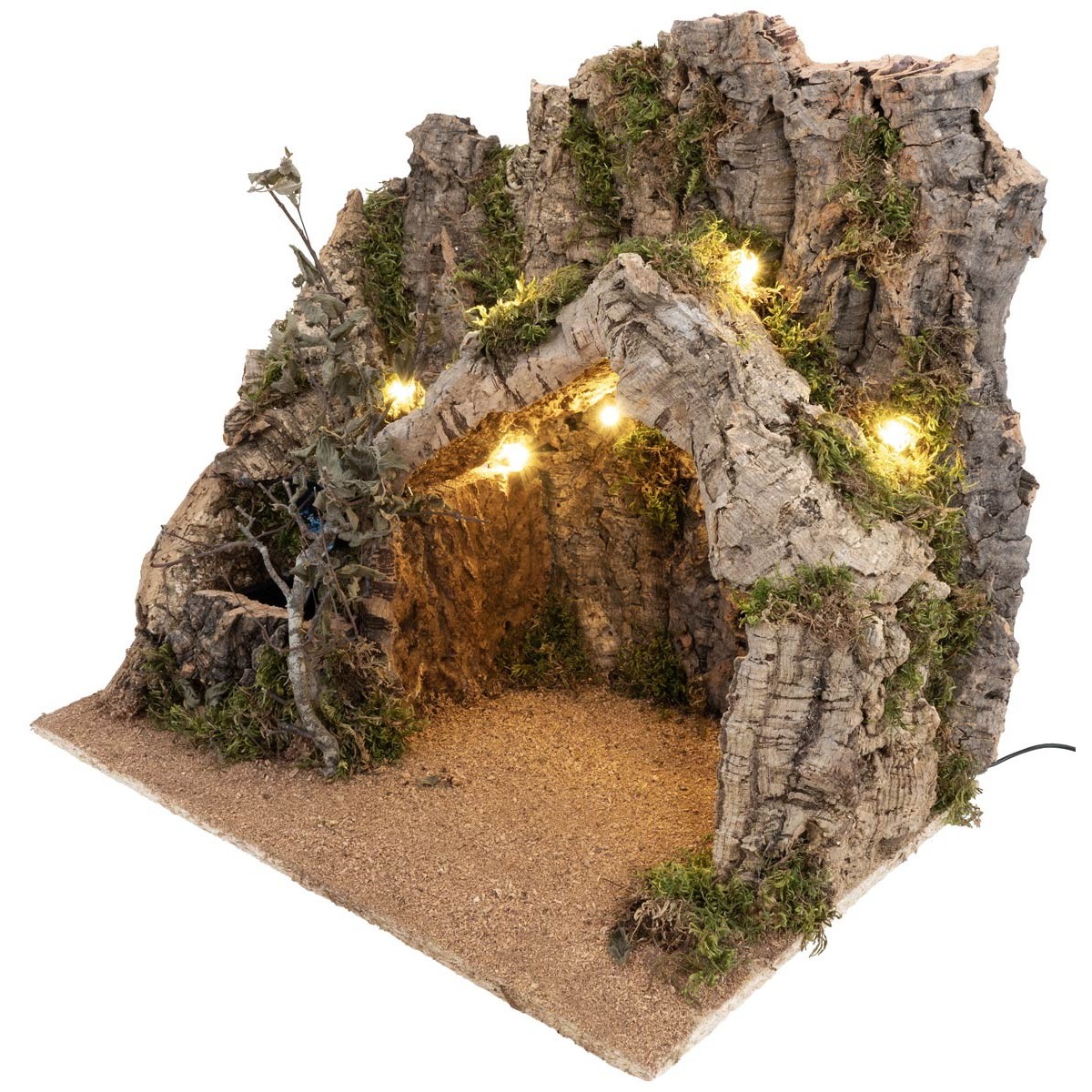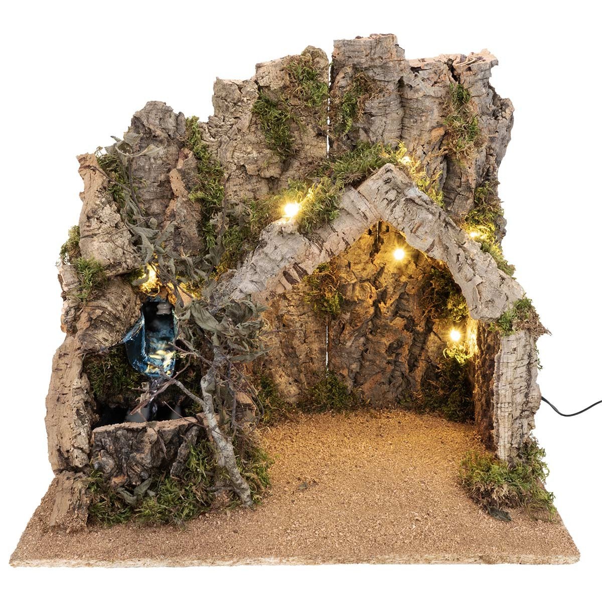 La scenografia presenta una capanna realizzata in corteccia di sughero pensata per ospitare la Natività, inserita in un contesto roccioso arricchito da muschio e dettagli naturali.