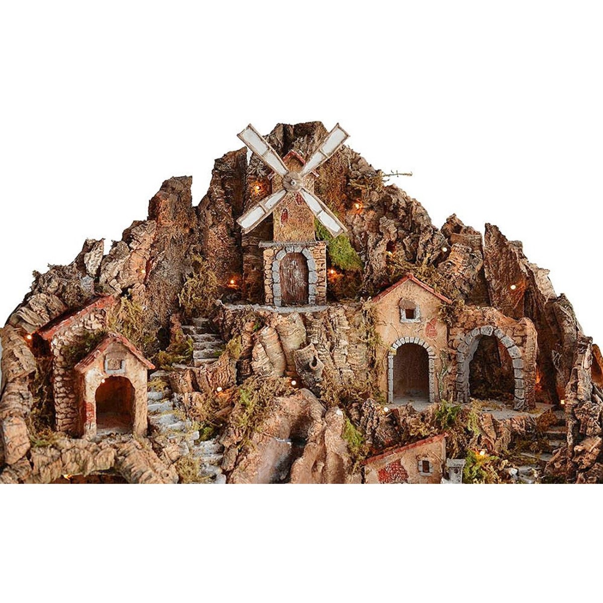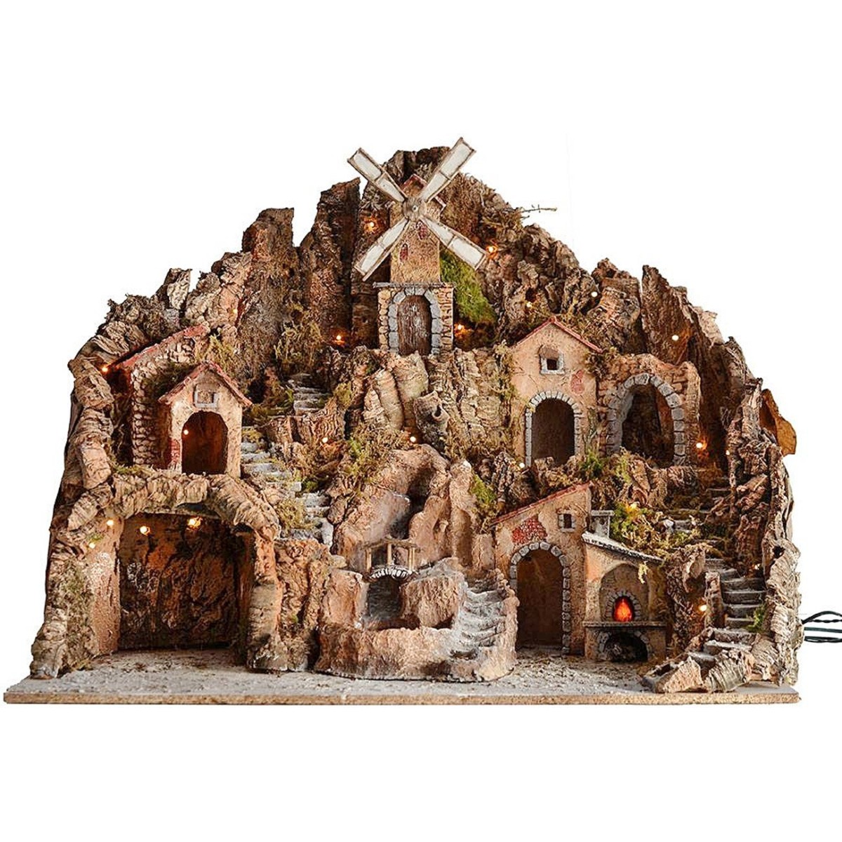 Presepe artigianale con illuminazione, mulino a vento in movimento, forno con effetto fuoco e cascata completa di pompa per il ricircolo d'acqua, alimentati a corrente.