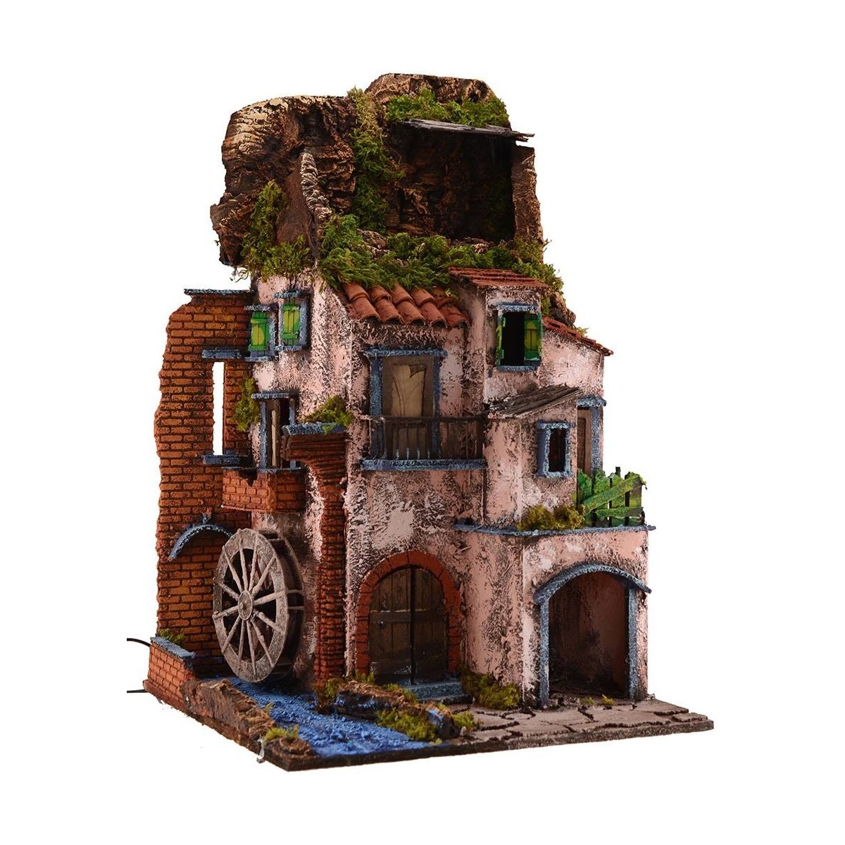 Borgo illuminato con ruota del mulino che gira alimentati a corrente. Struttura molto particolare e con tanti dettagli, che può essere utilizzata per ampliare il vostro presepe oppure come presepe completo magari collocando la natività all' interno dell'apertura ad arco in primo piano. Sono presenti diversi balconi e finestrelle con ante verdi per vivacizzare la costruzione, sovrastata da una roccia con rifugio coperto da una tettoia.