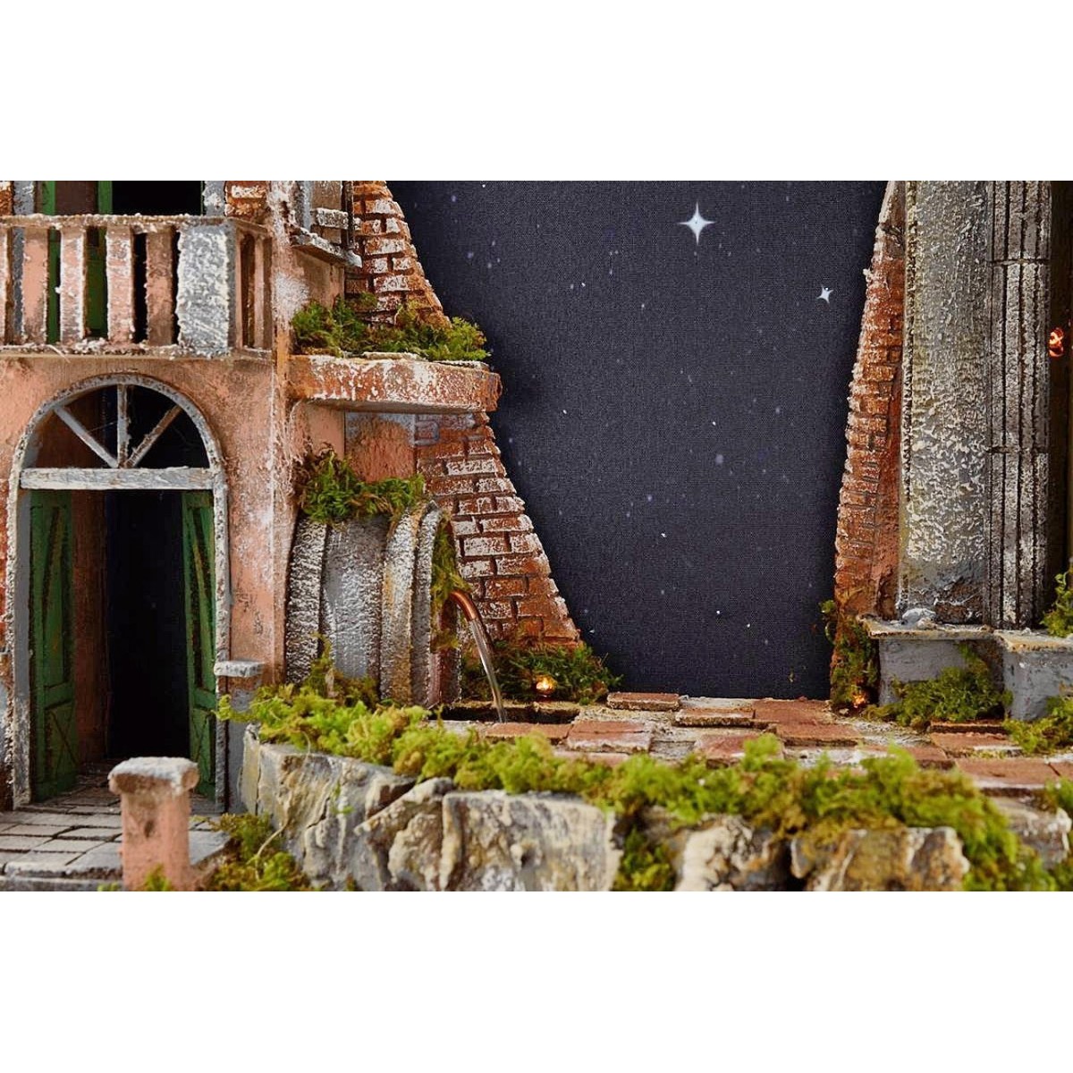 Presepe illuminato con sfondo effetto cielo stellato illuminato da luce tremolante a fibre ottiche funzionante a pile (2 batterie AA non incluse). Il presepe si presenta come un piccolo borgo dove troviamo un'abitazione disposta su due piani: al piano inferiore si accede attraverso un imponente ingresso ad arco con portone in legno a doppio battente aperto; mentre il piano superiore si presenta con un balcone da cui si notano le due porte finestre spalancate. Nella corte troviamo, inoltre, la presenza di una fontana da cui sgorga l'acqua funzionante a corrente, un rudere di tempio con vistose colonne ed una rustica tettoia con portico. Un elemento caratteristico del Presepe in oggetto è la verde vegetazione circostante. Il presepe è realizzato interamente in Italia da sapienti mani artigiane e risulta ben rifinito nei dettagli e molto luminoso, proprio perché illuminato sia dai led che si trovano nel Presepe e sia dallo sfondo del cielo stellato grazie alla luce tremolante delle fibre ottiche. Consigliato per statue da 11-12-13 cm.