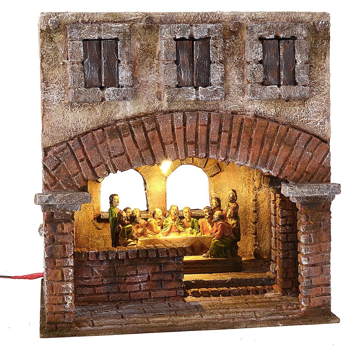 Ambientazione che rappresenta l'ultima cena di Gesù con gli apostoli. La scena si sviluppa al piano inferiore di un'abitazione da cui è possibile vederne l'interno grazie alla parete dotata di un grande arco aperto. Un muretto in primo piano e dietro tutto lo spazio della sala illuminata in cui è possibile riporre la grande tavolata con tutte le statue. La scenografia è adatta a statue di altezza di 9 cm o 10 cm disponibili nei prodotti correlati, la scenografia viene venduta vuota senza statue e le immagini complete hanno uno scopo puramente illustrativo. L'articolo è stato prodotto in Italia da sapienti mani artigiane con polistirene, legno e sughero.