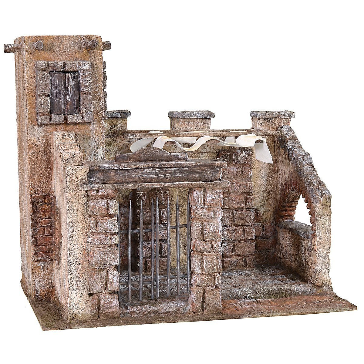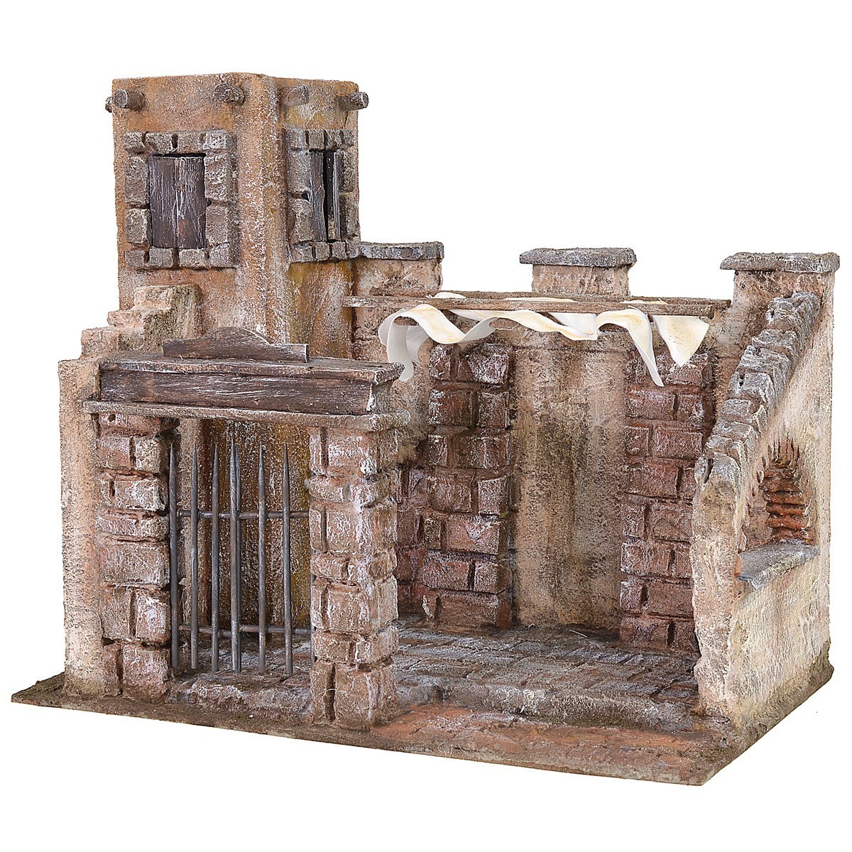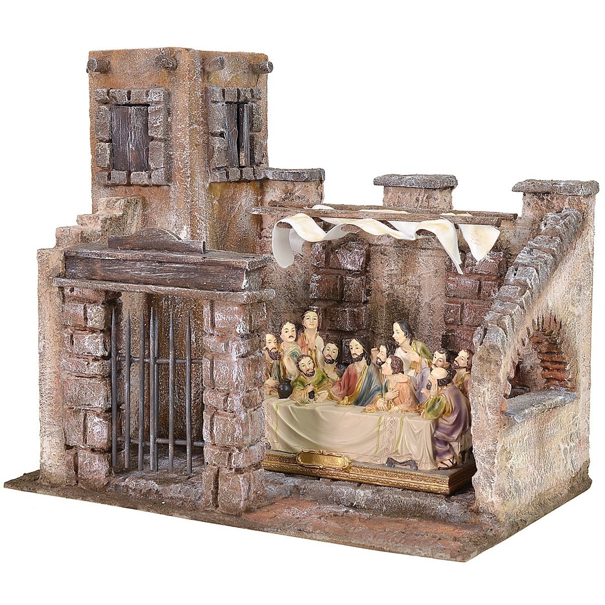Ambientazione che rappresenta l'ultima cena di Gesù. La scena si sviluppa nel cortile di un' abitazione a due piani, in primo piano un imponente cancello e dietro un grande spazio sotto una tenda dov'è possibile riporre la grande tavolata con tutte le statue. La scenografia è adatta a statue di altezza di 9 cm o 10 cm disponibili nei prodotti correlati, la scenografia viene venduta vuota senza statue e le immagini complete hanno uno scopo puramente illustrativo. L'articolo è stato prodotto in Italia da sapienti mani artigiane con polistirene, legno e sughero.