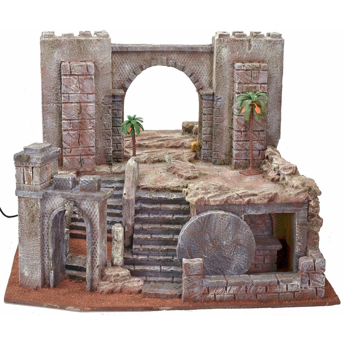 Diorama pasquale illuminato da poter personalizzare per rappresentare alcuni momenti della vita di Gesù utilizzando statue pasquali. In primo piano a sinistra un grande arco che porta ad una salita, ad esempio, è possibile rappresentare la salita di Cristo al monte Calvario. A destra il sepolcro con la porta aperta dov'è sia possibile, per esempio, riporre il corpo di Gesù esamine, oppure rappresentare il ritrovamento del sepolcro vuoto da parte di Maria Maddalena con l'angelo che le annuncia la resurrezione. Salendo le scale una grande oasi pianeggiante con le palme. La scenografia è completata sulla cima da un grande arco oltre il quale è possibile collocare la scena della crocifissione. Le statue per completare l'ambientazione sono disponibili nei prodotti correlati, i soggetti sono in resina e di altezza 9 cm. L'articolo è prodotto artigianalmente in Italia con polistirene legno e sughero.