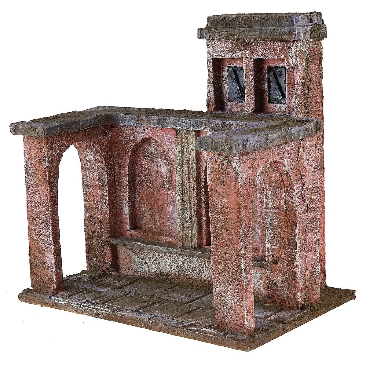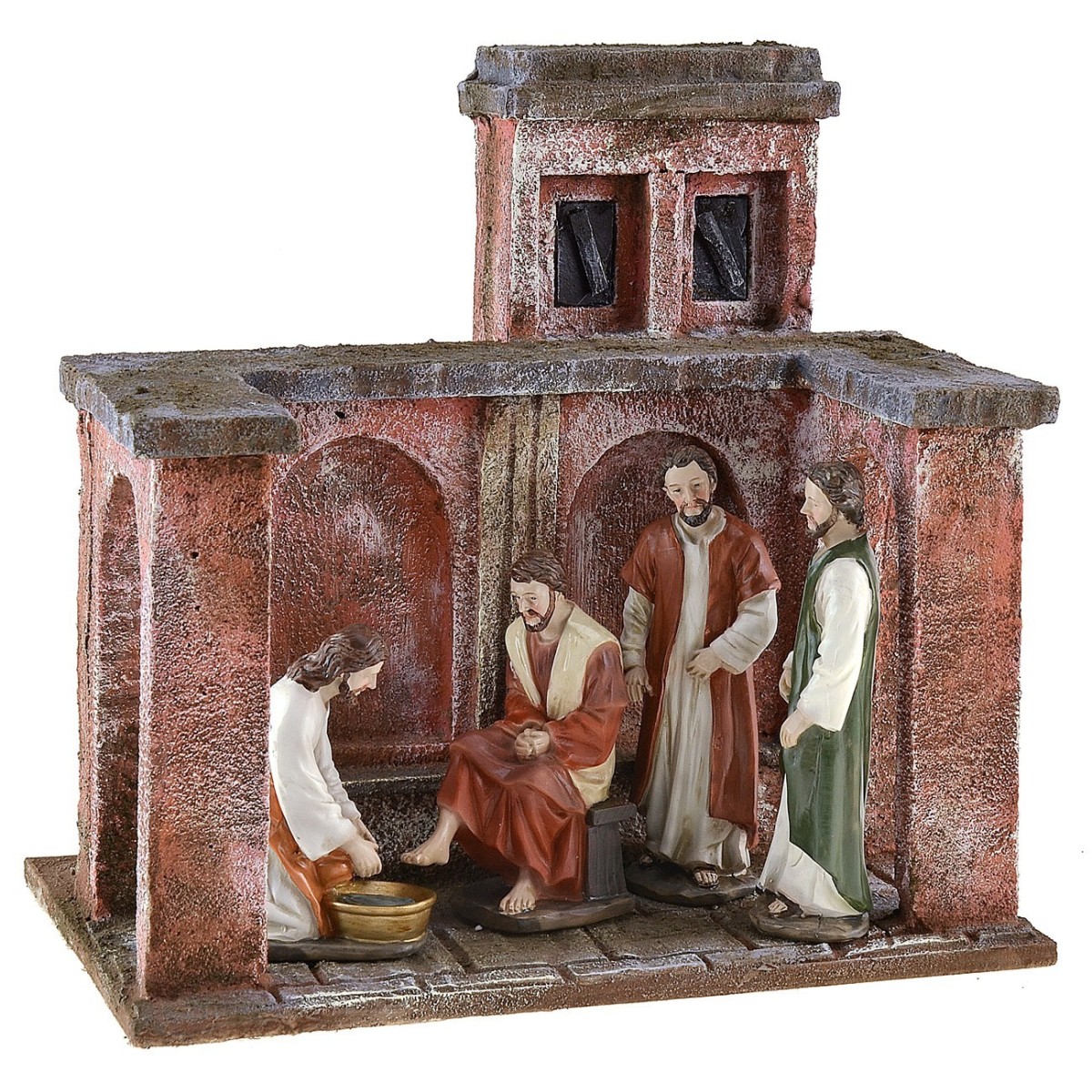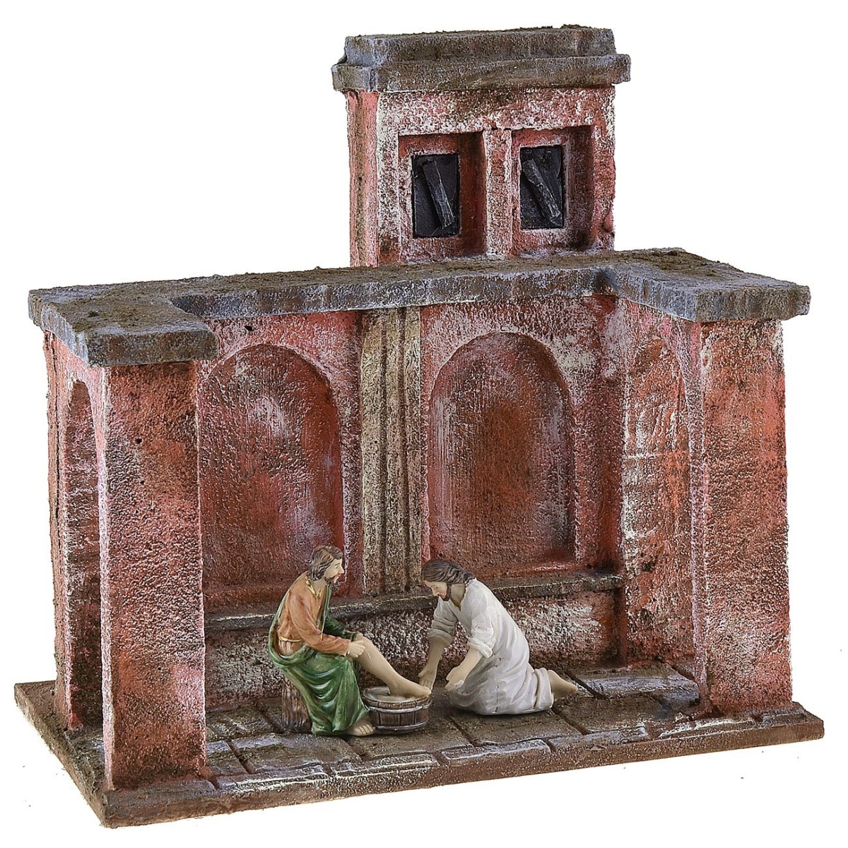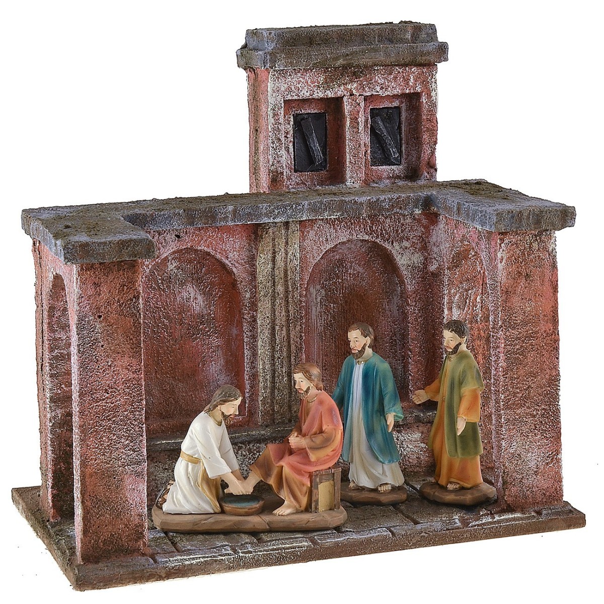 Ambientazione che rappresenta la lavanda dei piedi. La scena si sviluppa in un portico aperto con due archi a delimitare il luogo in cui Gesù lavò i piedi ai suoi discepoli, il gesto sta a significare che Cristo è venuto per servire e non per essere servito. L' ambientazione è adatta a statue di altezza da 9 a 12 cm disponibili nei prodotti correlati, la scenografia viene venduta vuota senza statue e le immagini complete hanno uno scopo puramente illustrativo. L'articolo è stato prodotto in Italia da sapienti mani artigiane con polistirene, legno e sughero.