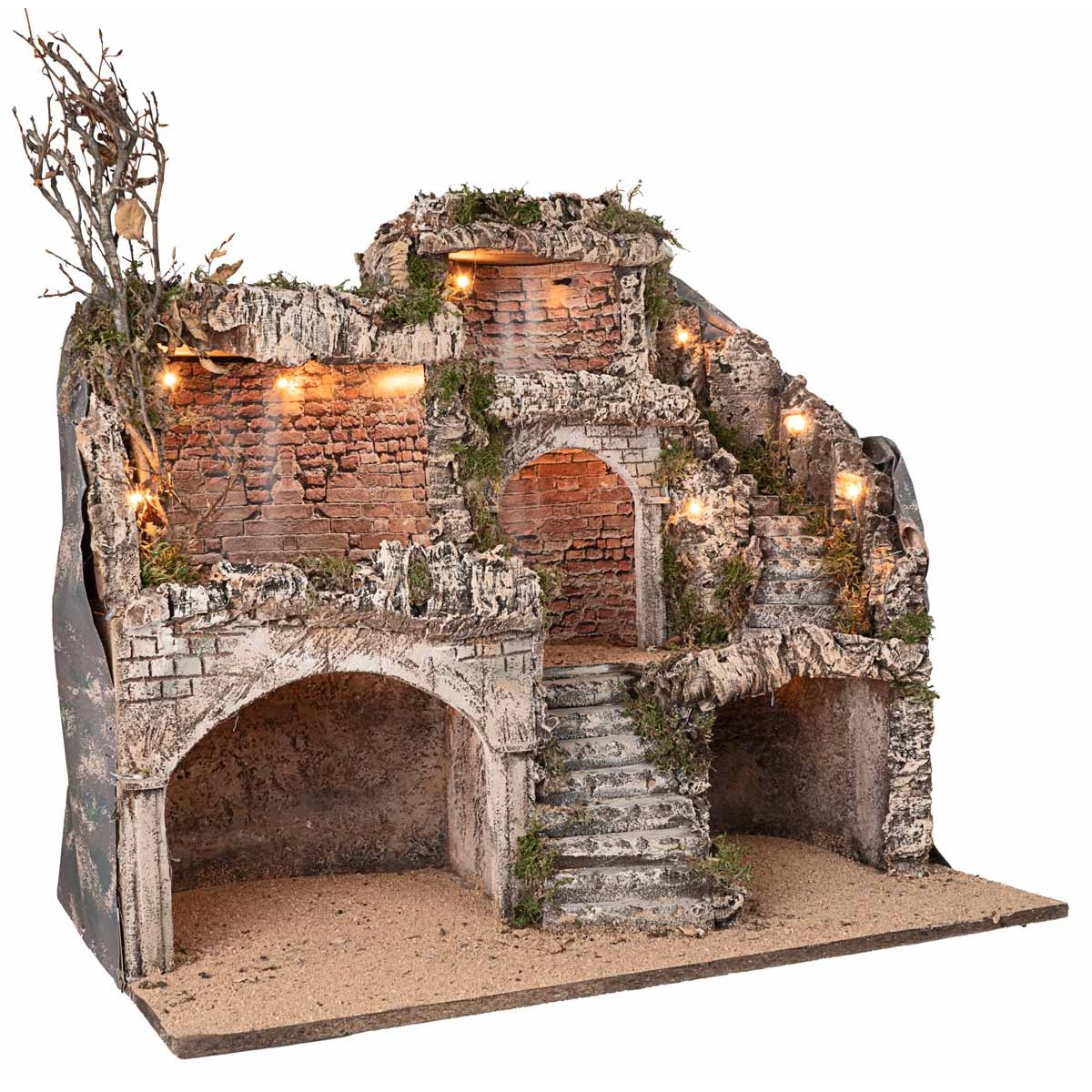 Presepe pasquale con illuminazione a corrente, ottimale per statue tra i 9 e i 12 cm. Presenta una struttura composta da cinque grotte, suddivisa su due livelli e connessi da due scalinate scenografiche. Il piano inferiore comprende due grotte principali e una grande scalinata che porta al livello superiore, dove si trovano altre due grotte e una seconda scalinata che conduce all'ultima grotta leggermente sopraelevata. Archi in mattoni e muschio decorativo arricchiscono quest'opera, ideale per rappresentare le scene della Passione e impreziosire l'atmosfera pasquale. Questo presepe è realizzato artigianalmente in Italia con materiali naturali come legno, sughero e muschio, offrendo un aspetto autentico e suggestivo. Nella sezione "Prodotti correlati" si possono trovare scene consigliate per completare il presepe.