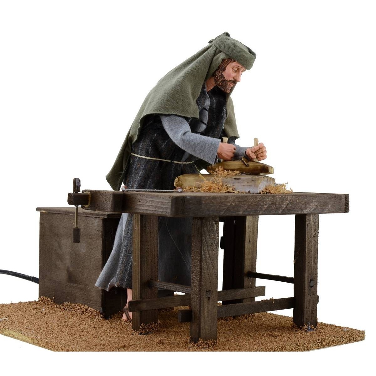 Falegname Arabo in movimento che pialla il legno realizzato in resina da sapienti mani artigiane italiane con volto molto espressivo; statua curata nei minimi dettagli dai colori, agli abiti e dal movimento veramente molto realistico e fluido. Nella scena nulla è lasciato al caso: dal tavolo da lavoro ricoperto di trucioli del legno e attrezzi, al mobile retrostante realizzato con cura.