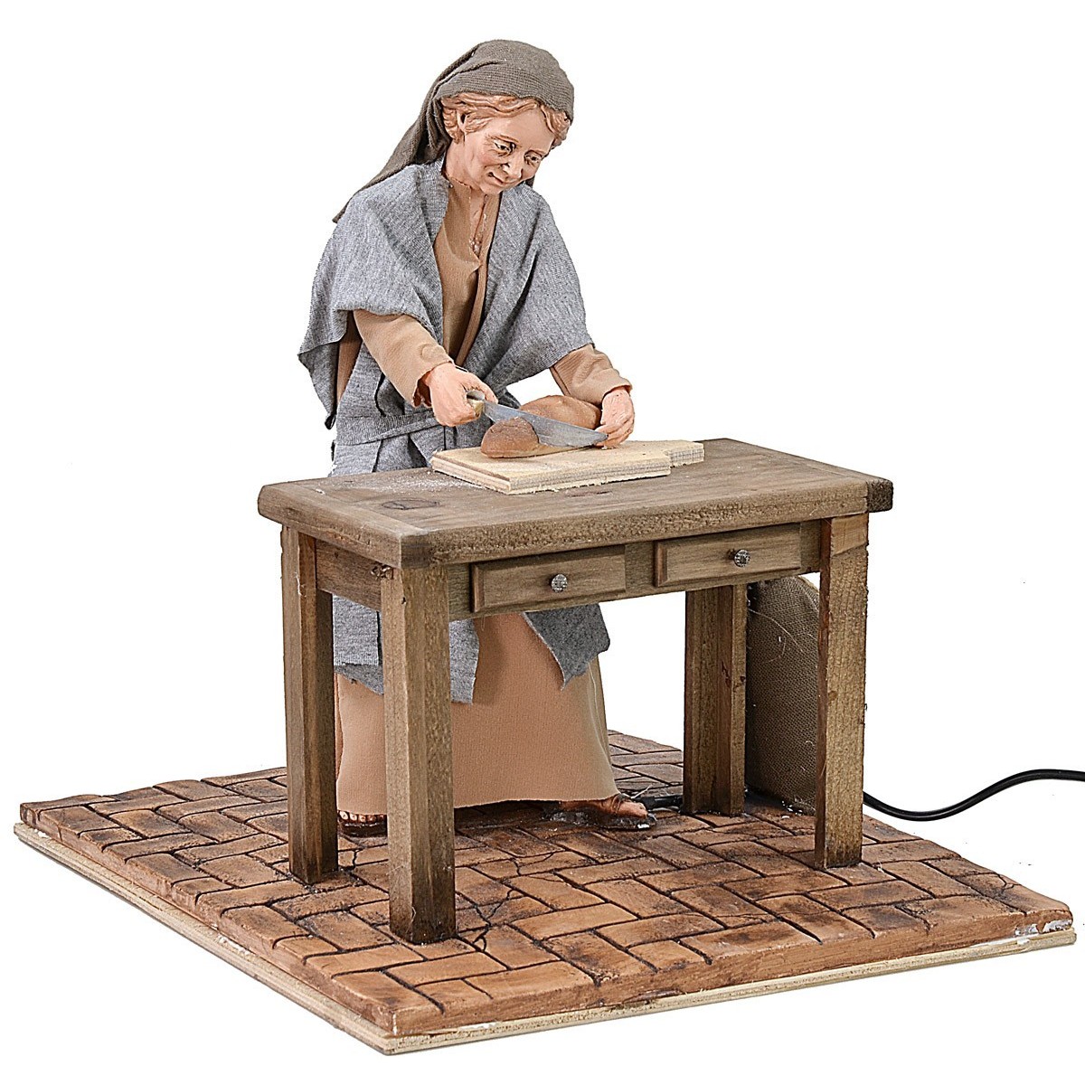 Donna Orientale in movimento che muovendo il braccio con cui impugna il coltello affetta il pane riposto sul raffinato tavolo in legno che impugna. La statua presenta un volto molto espressivo ed è stata curata nei minimi dettagli dai colori, agli abiti in tessuto e dal movimento veramente molto realistico e fluido. L'articolo è stato realizzato in resina da maestri artigiani italiani ed il meccanismo è funzionante a corrente. Essendo un prodotto realizzato interamente a mano i colori degli abiti possono variare.