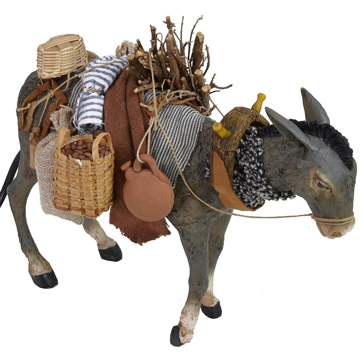 Asino Pigini in movimento che alza e abbassa la testa per statue da 30 cm. La meticolosità nello studio dei dettagli contraddistingue tutta la serie Pigini, infatti è da notare la cura e precisione con cui è stato decorato il carico dell'animale.