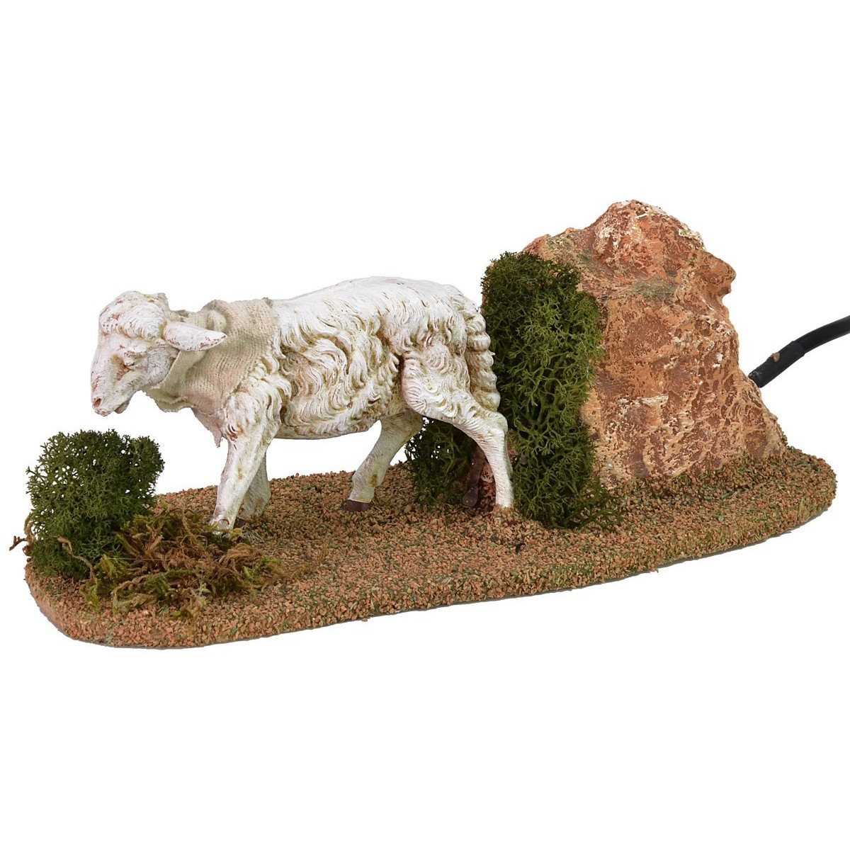 Pecora che bruca in movimento della serie Fontanini per statue di altezza 30 cm. L'ambientazione è rifinita con una parete rocciosa a mattoni rossi in rilievo e del muschio verde. La scena può essere arricchita con le tante minuterie disponibili nella sezione dedicata.