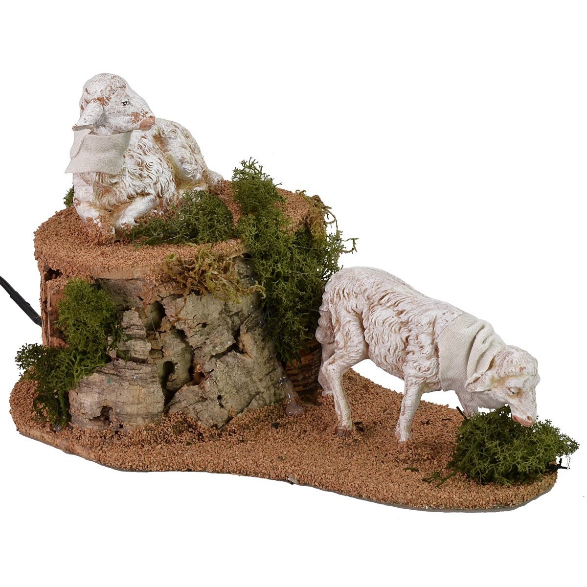 Scena con doppio movimento, la pecora in piedi bruca e quella seduta sul tronco gira la testa, entrambe fanno parte della serie Fontanini e sono consigliate per statue di altezza 30 cm. L'ambientazione è rifinita con un grande tronco e del muschio verde. La scena può essere arricchita con le tante MINUTERIE disponibili nella sezione dedicata.