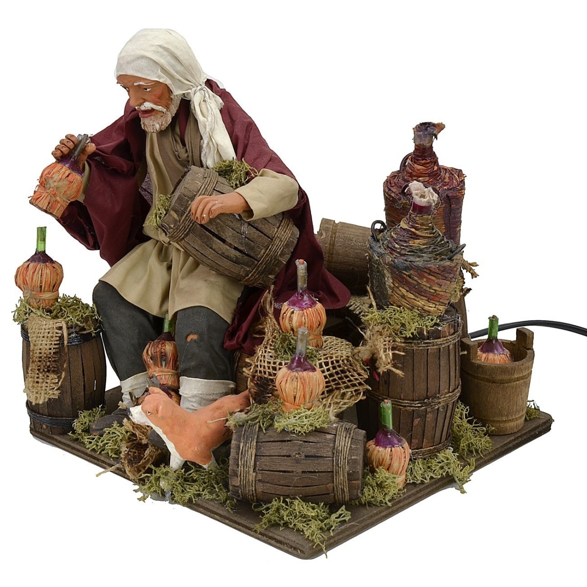 Beone in terracotta vestito che avvicina il fiasco pieno di vino alla bocca, mentre nell'altra mano afferra una piccola botte di legno. La scena è ben rifinita e decorata con altri fiaschi e botti, oltre che uva colorata e licheni. La statua fa parte della serie cm 30, ma essendo seduta e non in posizione eretta misura 21 cm. Questo articolo è funzionante a corrente.