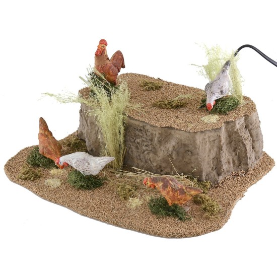 Scena per presepe con tre galline a terra ed una sopra la roccia con un gallo che si muovono avanti e indietro simulando l'azione di beccare il mangime, oltre al gallo che gira la testa di lato. L'ambientazione si presenta ben rifinita nei minimi dettagli con cespugli, muschio e sughero che coprono la parte motore funzionante a corrente. L'articolo è consigliato per statue di altezza cm 30 ed è stato realizzato interamente in Italia da sapienti mani artigiane utilizzando legno, sughero e muschio. La statua non è inclusa e l'immagine ha finalità puramente illustrativa per far capire la proporzione con la contadina serie cm 30, la statua è acquistabile separatamente ed è presente nei correlati sotto la tabella.