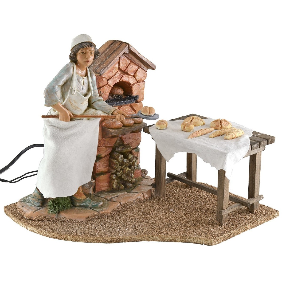 Panettiere in movimento che ruotando il busto simula l'azione di infornare la pagnotta poggiata sulla pala. La statua fa parte della serie Fontanini 30 cm ed è rifinita con un grembiule in tessuto. L' ambientazione per presepe è arricchita da un tavolo in legno imbandito dal pane fresco, oltre che da un forno illuminato con una luce lampeggiante effetto fuoco e funzionante a corrente.