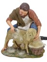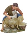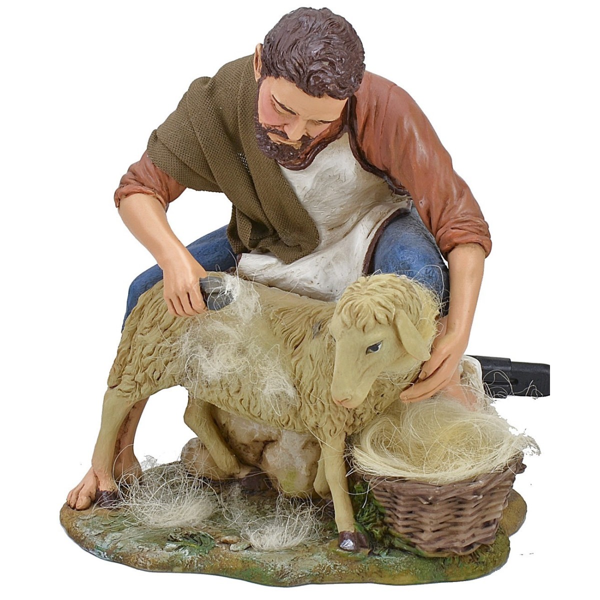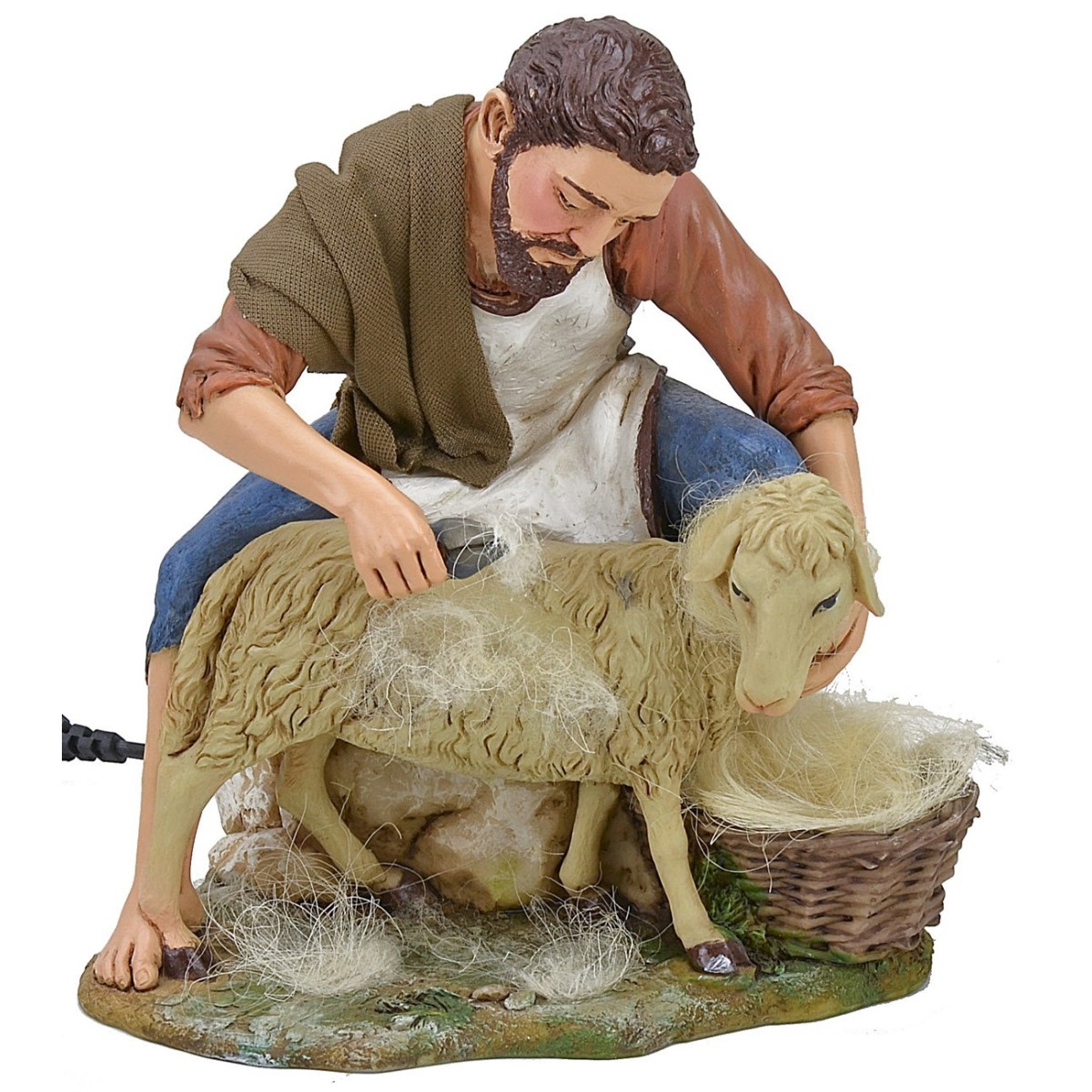 Pastore seduto in movimento che con la mano destra rade la pecora che muove la testa. La meticolosità nello studio dei dettagli e l'espressività dei visi sono caratteristiche che contraddistinguono tutta la serie Pigini oltre che abiti in tessuti finemente cuciti a seconda dei soggetti.