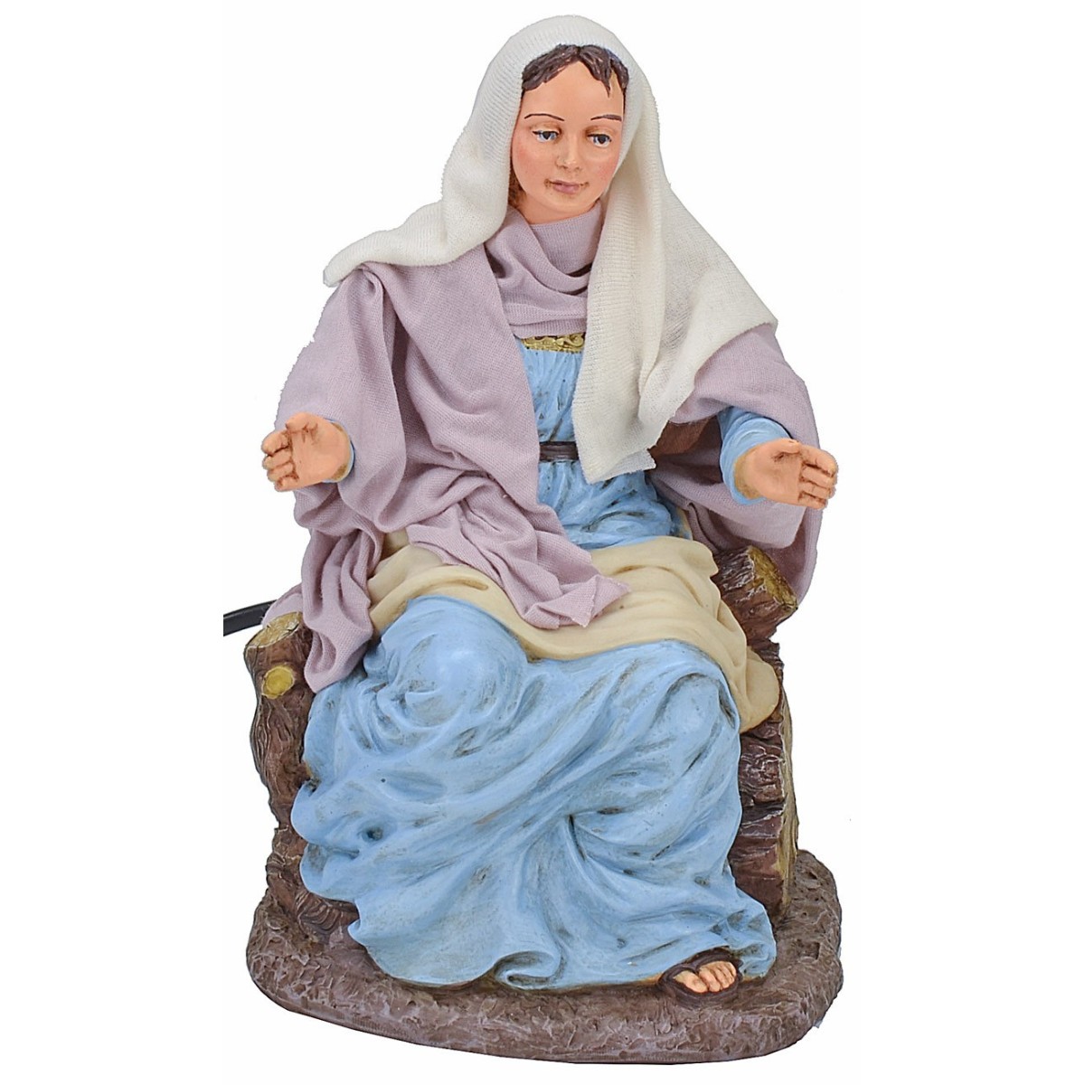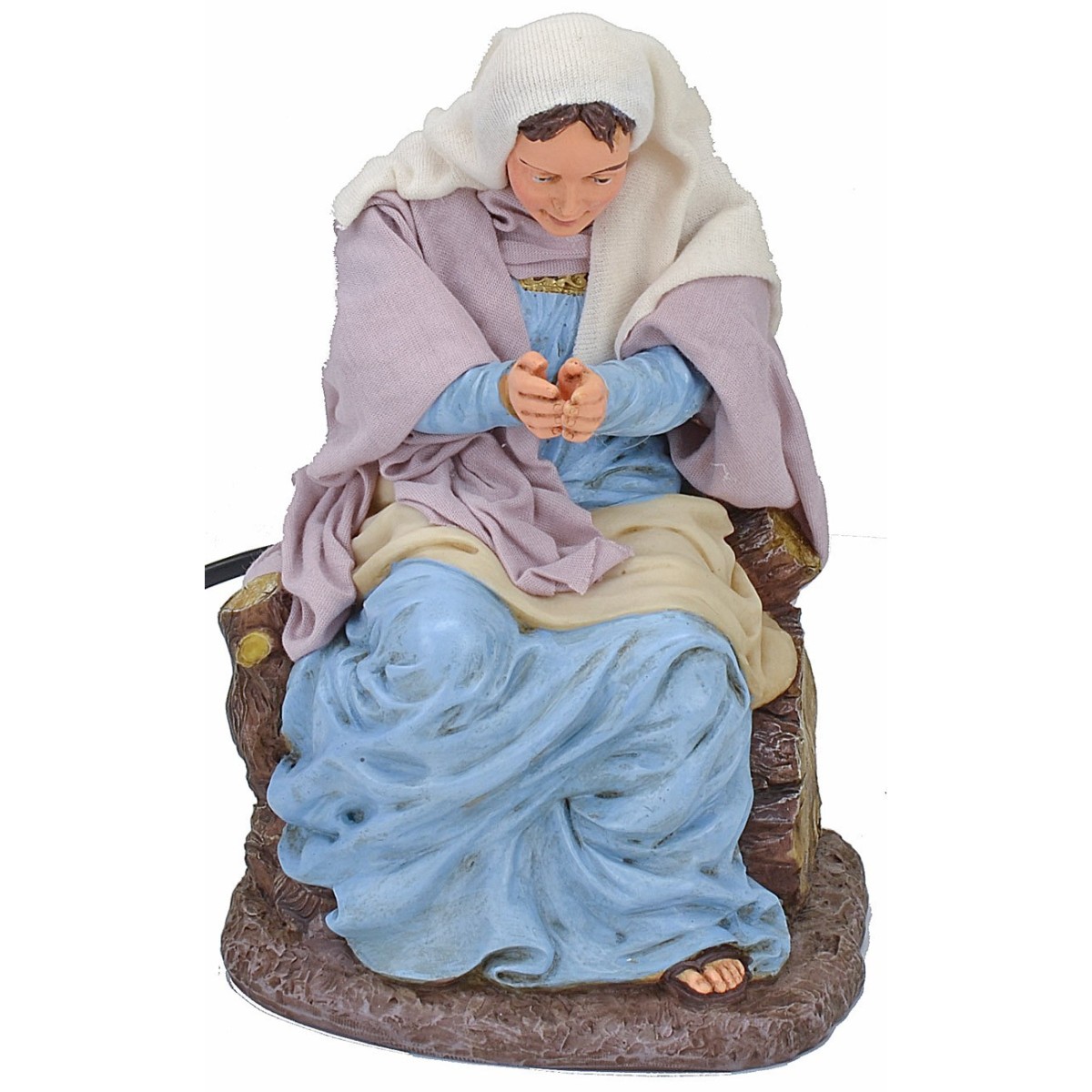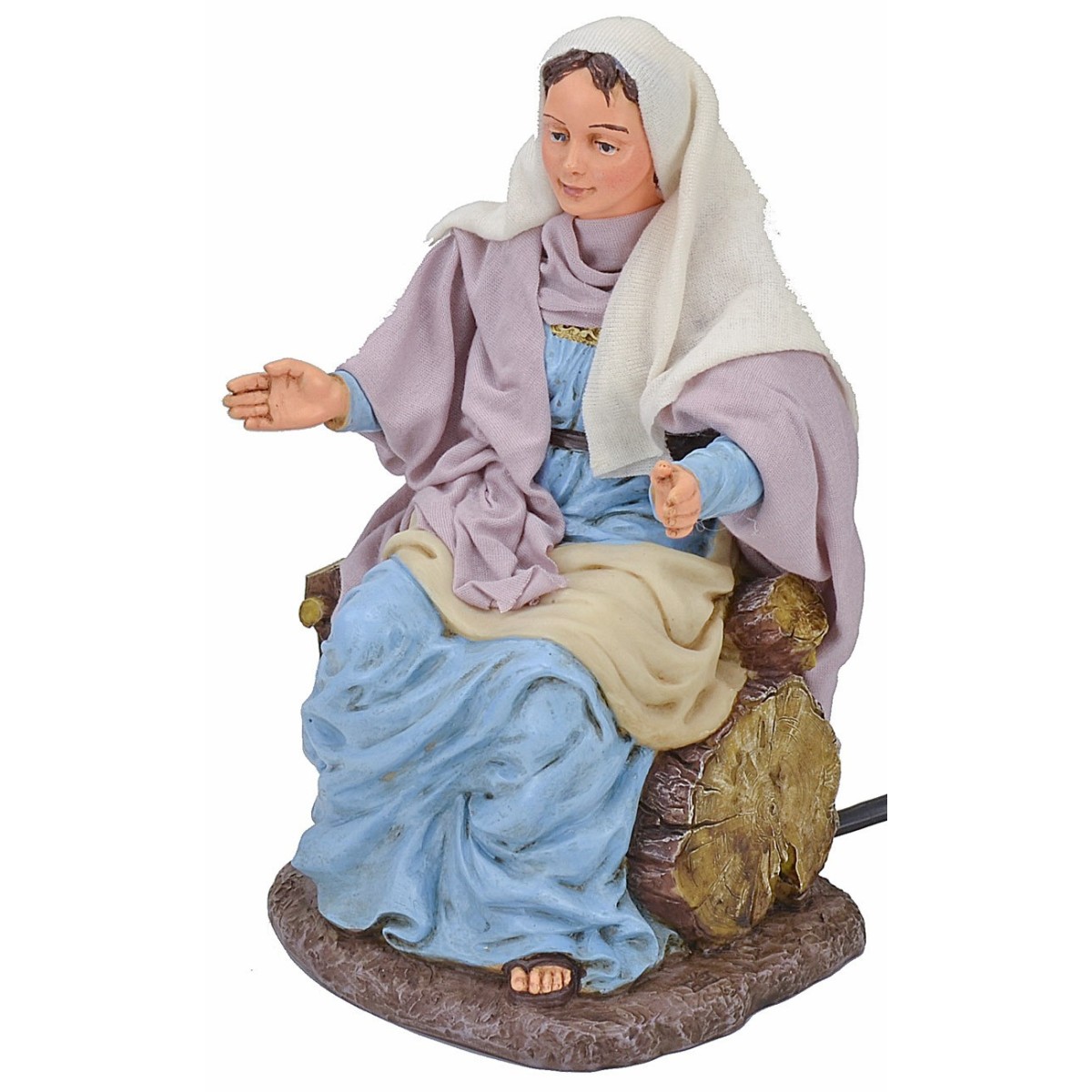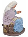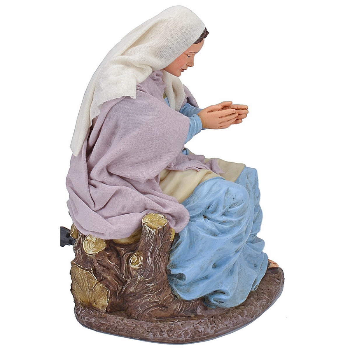 Maria in movimento china il capo e congiunge le mani seduta su un troncone d'albero. La meticolosità nello studio dei dettagli e l'espressività dei visi sono caratteristiche che contraddistinguono tutta la serie Pigini oltre che abiti in tessuti finemente cuciti a seconda dei soggetti.