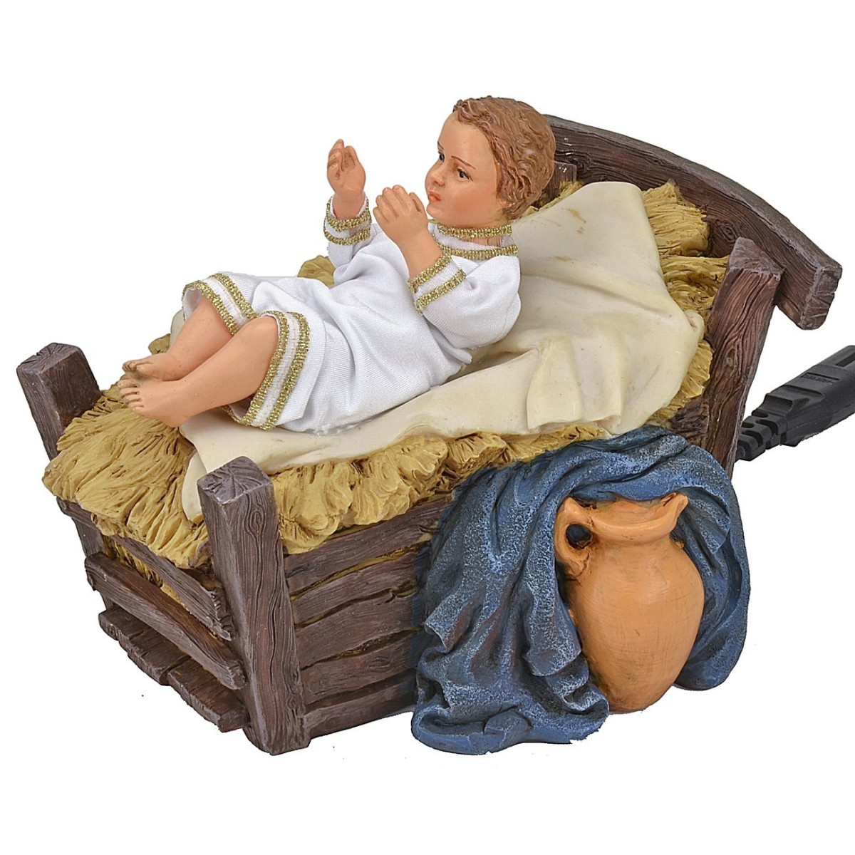 Gesù Bambino nella culla in movimento alza e abbassa la testa mentre allarga le braccia. La meticolosità nello studio dei dettagli e l'espressività dei visi sono caratteristiche che contraddistinguono tutta la serie Pigini oltre che abiti in tessuti finemente cuciti a seconda dei soggetti.