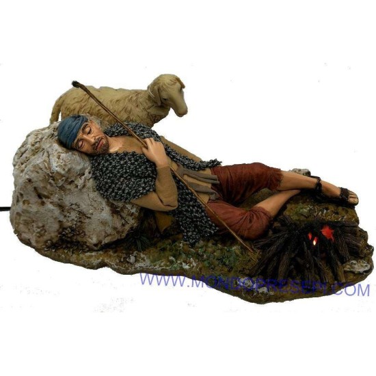 Dormiente Orientale 30 cm, con movimento respiratorio dell'addome visibile e pecora che gira la testa con luce effetto fuoco, il tutto funzionante a corrente.