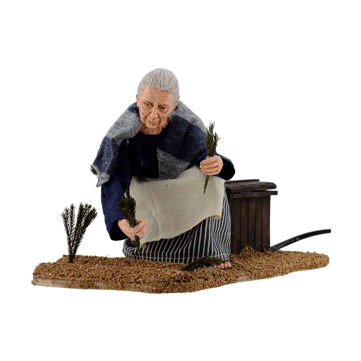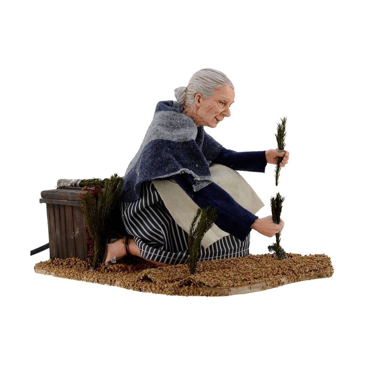 Donna anziana nell'orto in movimento, statua in resina vestita in tessuto.