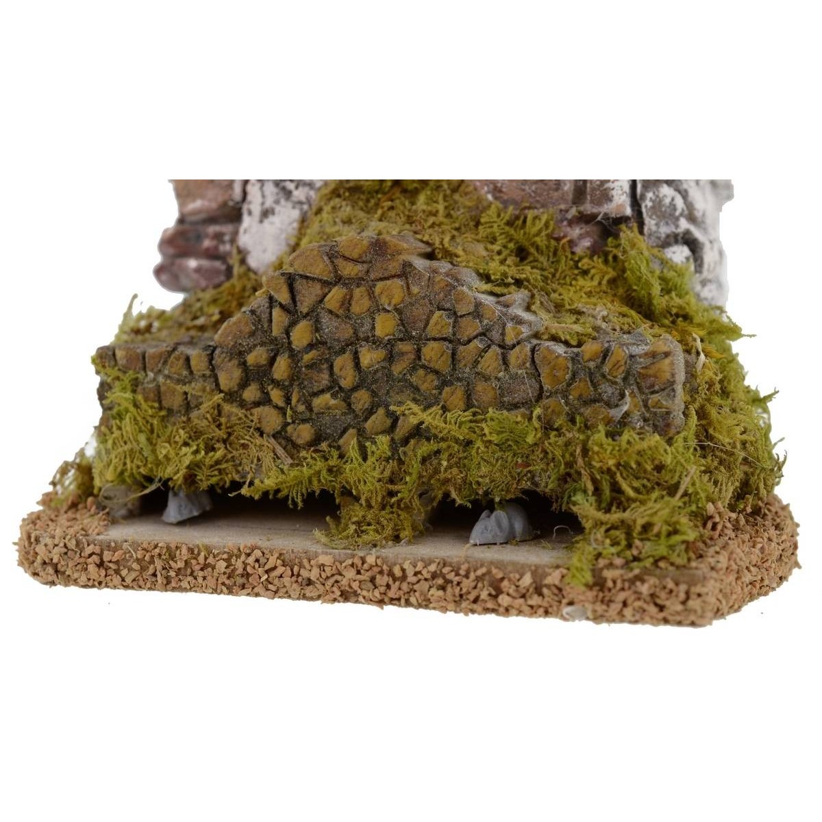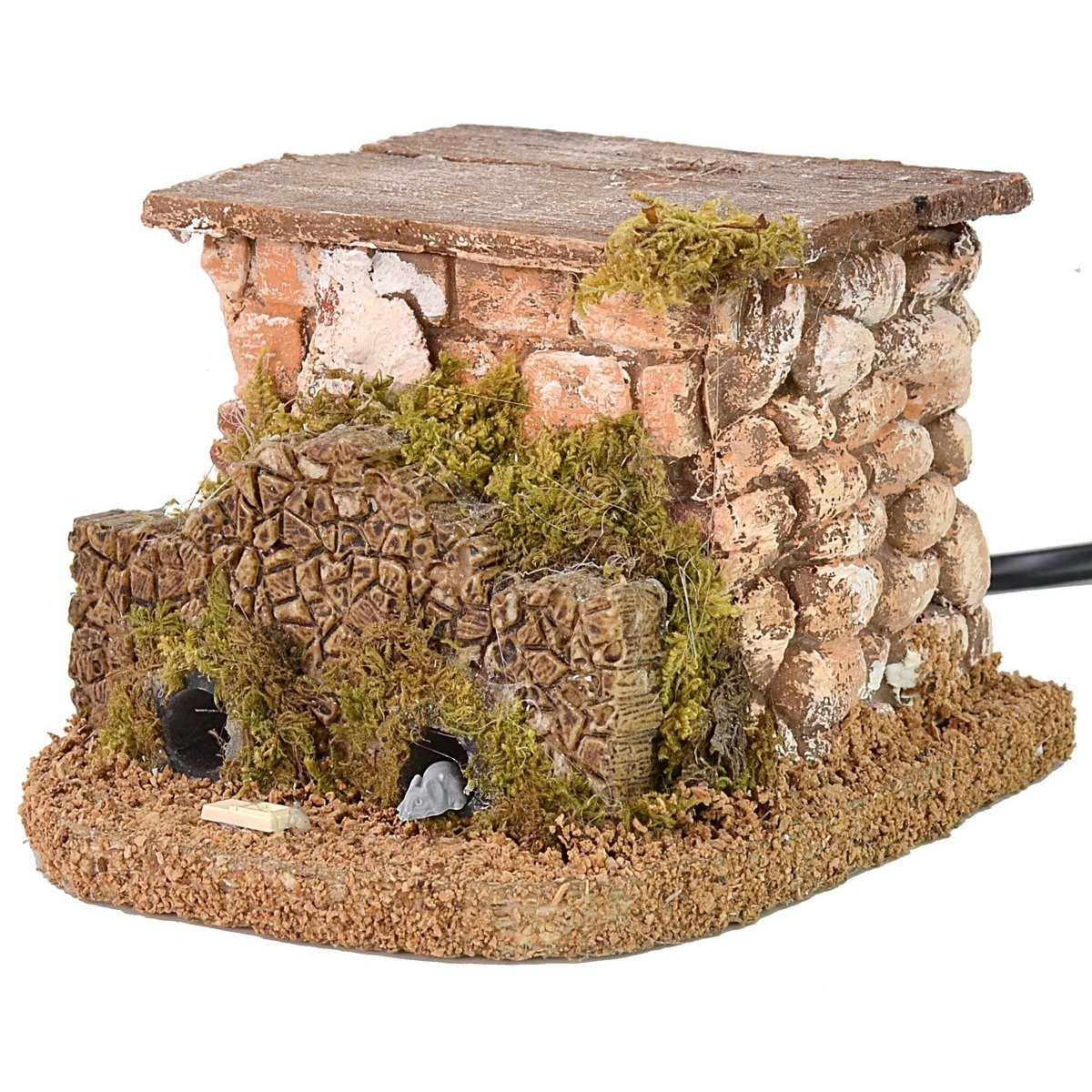 Scena con due topi in movimento, esclusiva Mondopresepi 2020, realizzata interamente in Italia da sapienti mani artigiane. Il movimento dei due topolini che entrano ed escono dalla loro tana sotto la legna accatastata risulta molto fluido. La scena è stata rifinita nei dettagli con legna in resina dipinta a mano e decorata con muschio, la parete retrostante in mattoni molto realistica funge da copertura al meccanismo. I topi possono essere abbinati a statue di altezza cm 8-10.