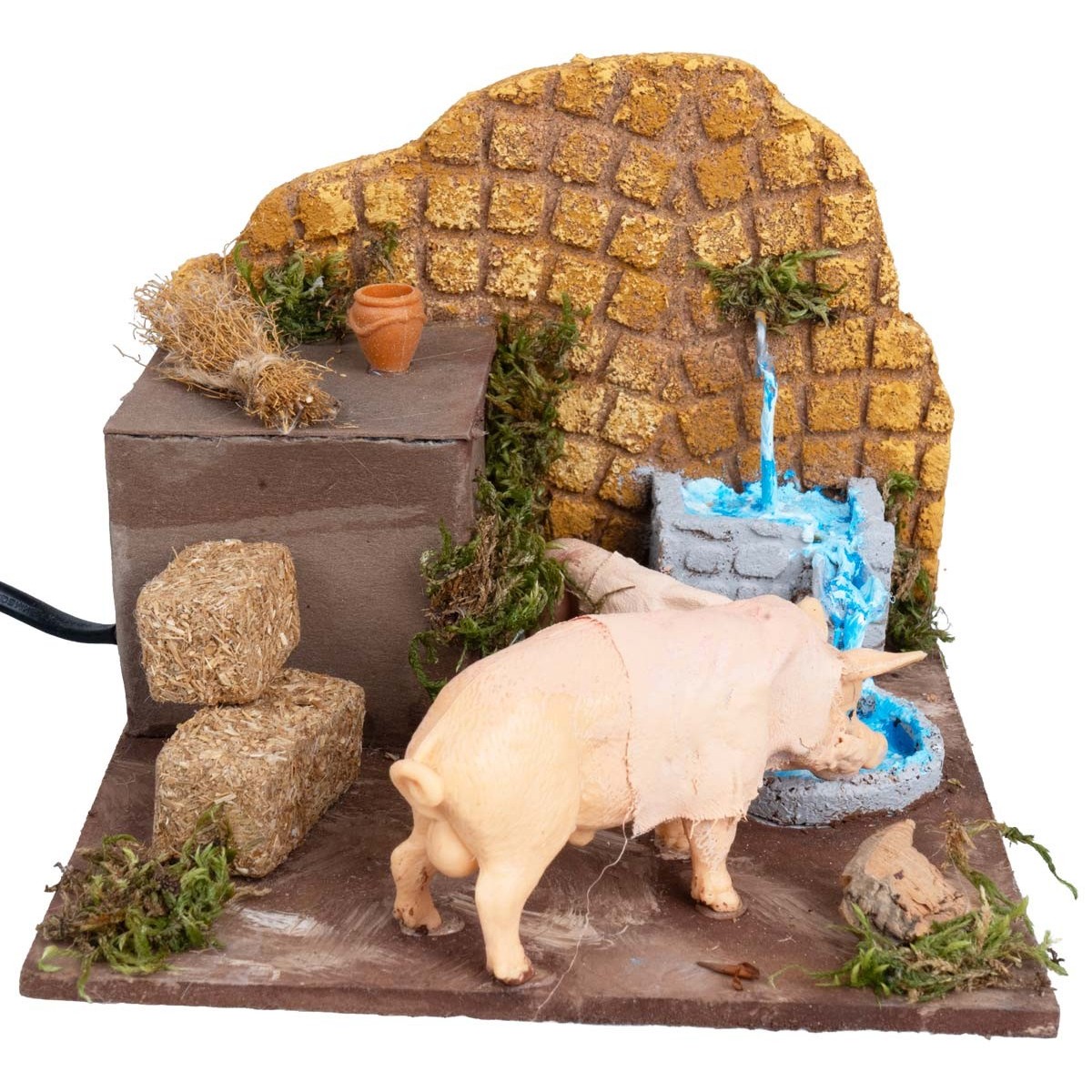 L’ambientazione raffigura un piccolo recinto rustico con abbeveratoio e fontana laterale, arricchito da balle di fieno, muschio decorativo e parete effetto pietra. La scena comprende un maiale adulto e un maiale piccolo in terracotta. Entrambi compiono il doppio movimento di muovere la testa su e giù, simulando il gesto di bere e nutrirsi in modo realistico.