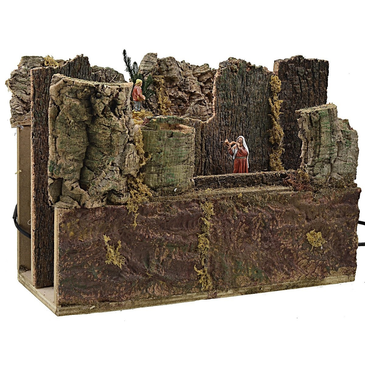 Paesaggio montano per Presepe con pastore e pecorelle della serie Landi 6cm in secondo piano che pascolano con movimento da sinistra verso destra, mentre in primo piano si trovano tre personaggi della serie Landi 6,5cm in cammino con movimento inverso da destra verso sinistra. L'articolo è stato interamente prodotto in Italia in legno, sughero e mushio; il meccanismo è funzionante con cavo d'alimentazione a corrente.