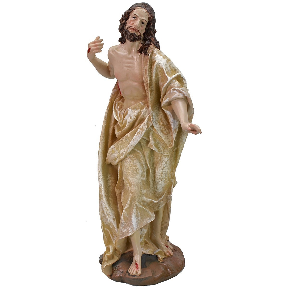 Gesù risorto con croce d'oro addobbata con drappo. La statua è ben rifinita nei dettagli: realizzata interamente in resina e dipinta a mano da sapienti mani artigiane. Il volto risulta molto espressivo e rifinito nei particolari.