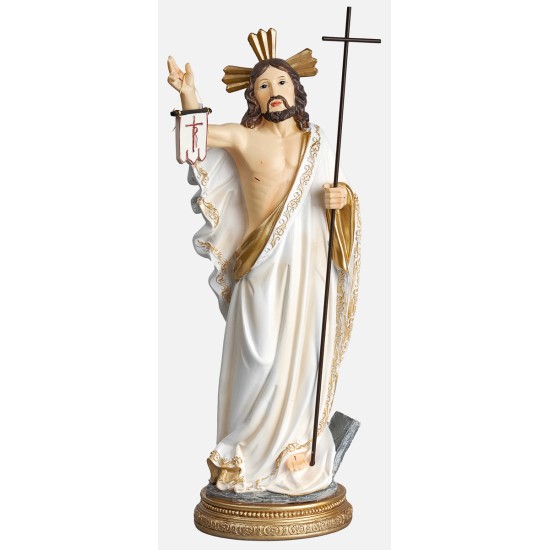 Statua del Cristo Risorto, alta 22.2 cm, realizzata in resina dipinta. Raffigura Gesù in abito bianco con dettagli dorati, mentre tiene una croce e alza la mano in segno di benedizione. Rappresenta la resurrezione, simbolo di speranza e vittoria sulla morte.
