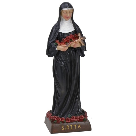 Statua in resina ben rifinita e dipinta a mano alta 20 cm che raffigura Santa Rita da Cascia. La monaca indossa il classico abito nero dell'ordine agostiniano e sorregge tra le mani un crocefisso con rose rosse. Sulla base su cui si erge è inciso il nome e sono riposte in senso circolare altre rose, questo fiore è uno dei simboli di Santa Rita.