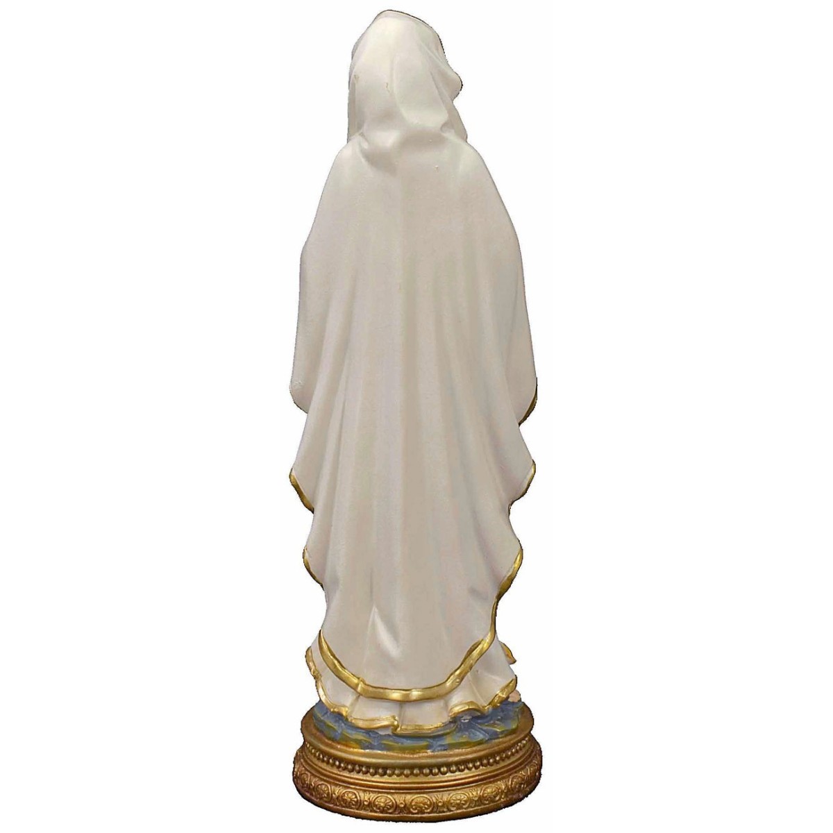 Madonna di Lourdes alta 20 cm in resina dipinta a mano, la statua è ben rifinita e poggia sopra un piedistallo dorato. La Vergine vestita di bianco è in posizione eretta con le mani giunte in segno di preghiera ed al braccio è appeso un rosario d'oro .