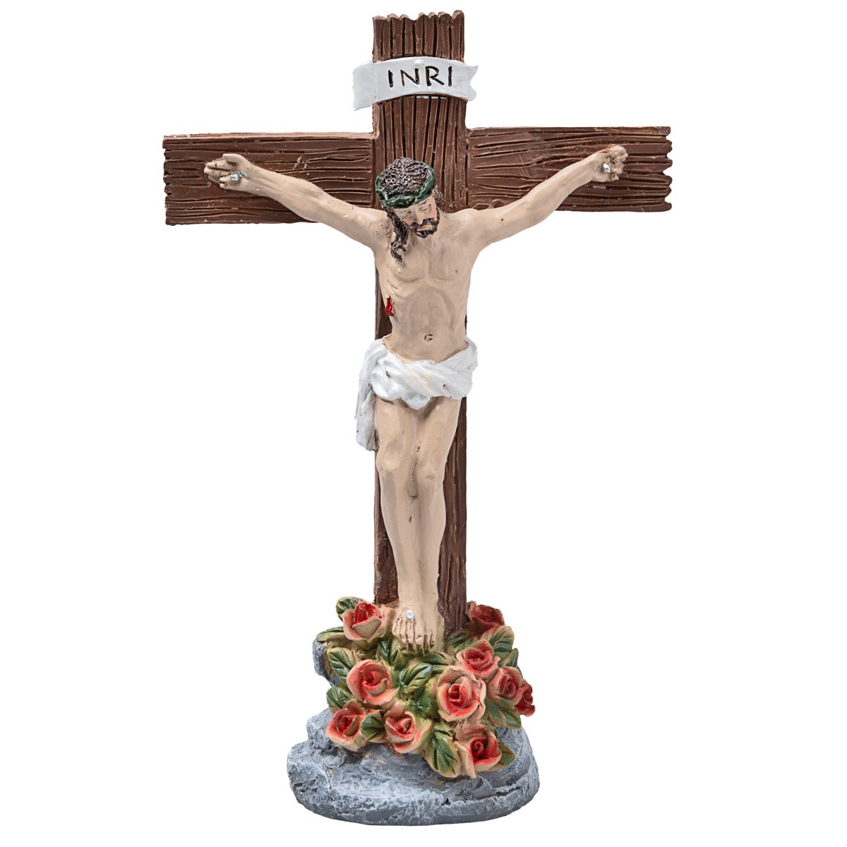 Statuina raffigurante Gesù crocifisso, realizzata in resina e dipinta a mano. La figura di Gesù è alta 12 cm, mentre la croce ha un'altezza di 20 cm. La base, decorata con rose, simboleggia amore, sacrificio e speranza cristiana. Curata nei dettagli, è ideale per presepi pasquali, diorami religiosi o come oggetto sacro da collezione. Perfetta per ogni ambiente religioso grazie alla qualità artigianale e al realismo della lavorazione.