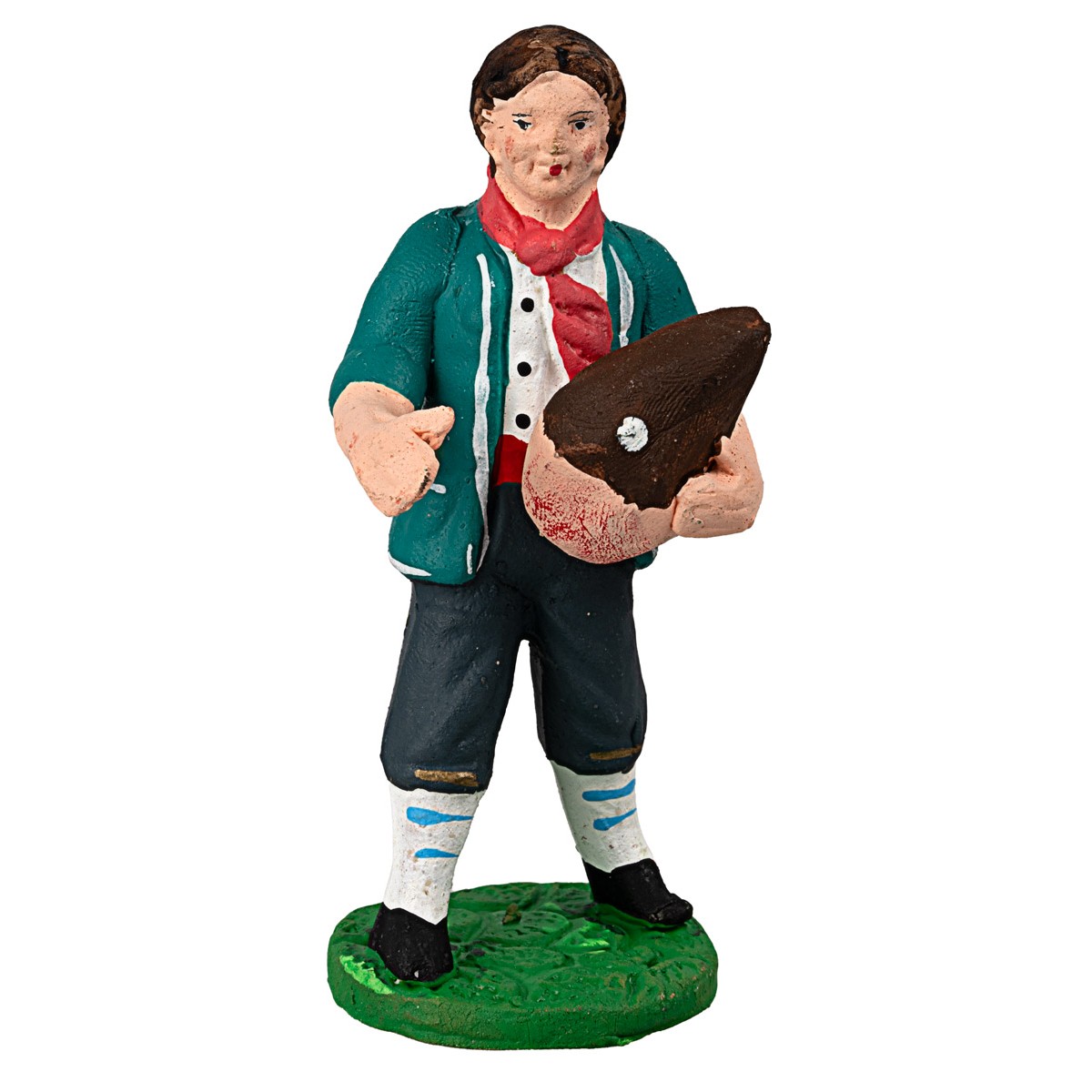 Statua artigianale in terracotta 10 cm, raffigurante un salumiere con un prosciutto in mano.