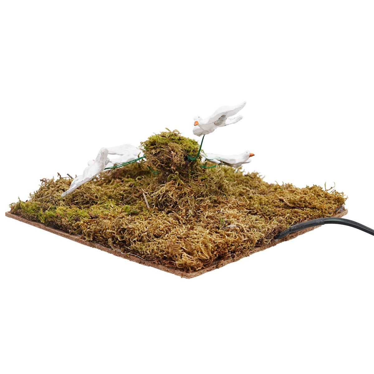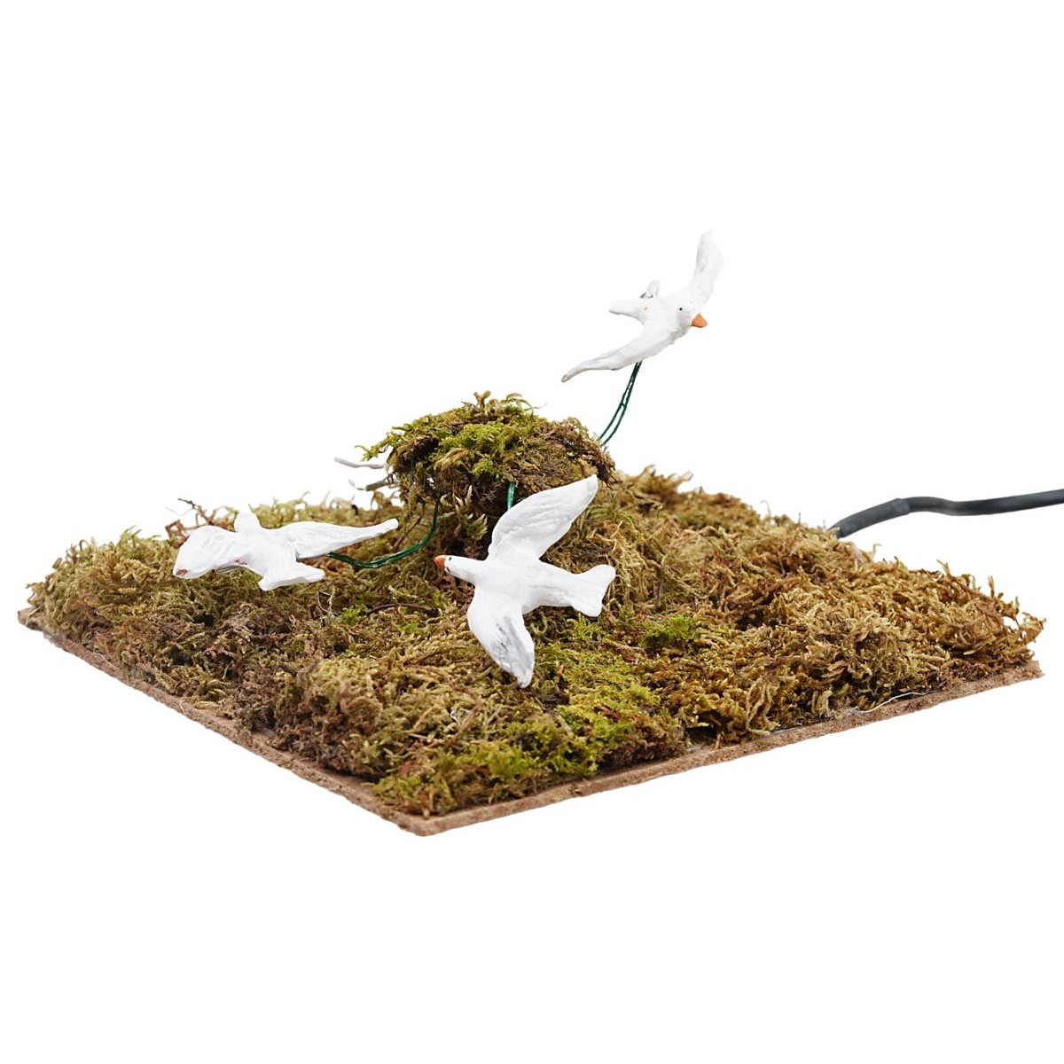 Quattro gabbiani in volo che ruotano circolarmente, consigliati per statuine di altezza da 15 cm a 24 cm. I volatili sono in terracotta dipinta a mano e funzionano a corrente. La scenografia che li accompagna è realizzata con materiali naturali come legno e muschio.