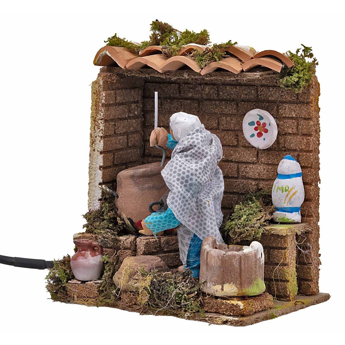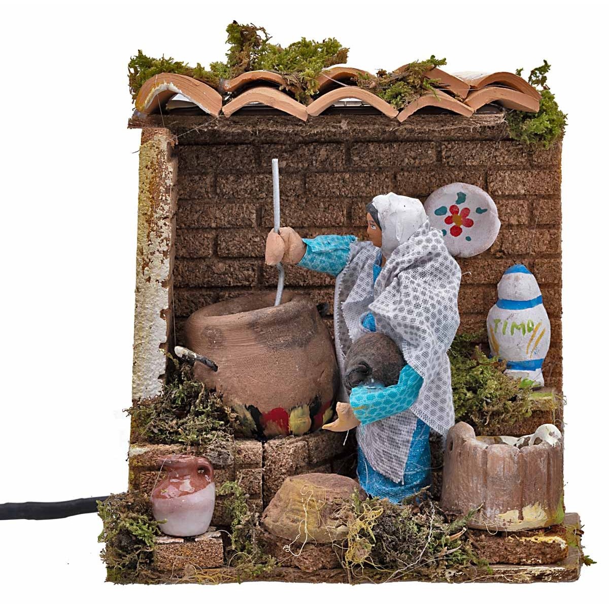 Donna che con il movimento del braccio, simula l'azione di cucinare. La statuina è realizzata in terracotta e dipinta a mano in Italia da sapienti mani artigiane con abiti in tessuto ben rifiniti. La figura per il Presepe classico e/o napoletano, è realizzata in terracotta ed è funzionante a corrente. Si precisa che i particolari del prodotto possono variare in quanto realizzato artigianalmente.
