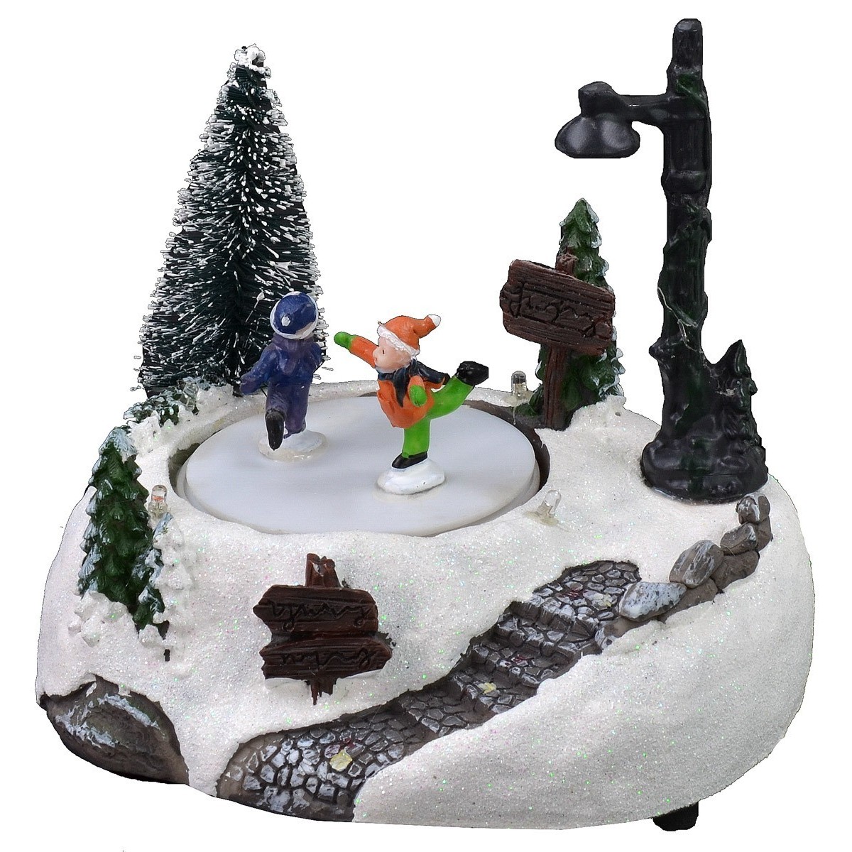 Scenografia natalizia cm 15,5x11x14 h raffigurante una pista da pattinaggio con 2 ragazzini che si divertono. L'articolo, realizzato in plastica e resina, prevede due modalità di funzionamento: possono essere attivati solo il movimento della pista e le luci, oppure è possibile attivare sia il movimento e le luci che la musica. Il prodotto è funzionante tramite batterie NON incluse nell'acquisto.