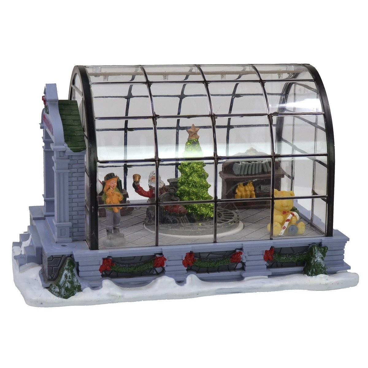 Serra natalizia cm 22,5x14,5x15 h con Babbo Natale sul trenino che gira attorno all'albero, a completare la scena alcune decorazioni natalizie. L'articolo, realizzato in plastica e resina, prevede due modalità di funzionamento: possono essere attivati solo il movimento e le luci, oppure è possibile attivare sia il movimento e le luci che la musica. Il prodotto è funzionante tramite batterie NON incluse nell'acquisto.