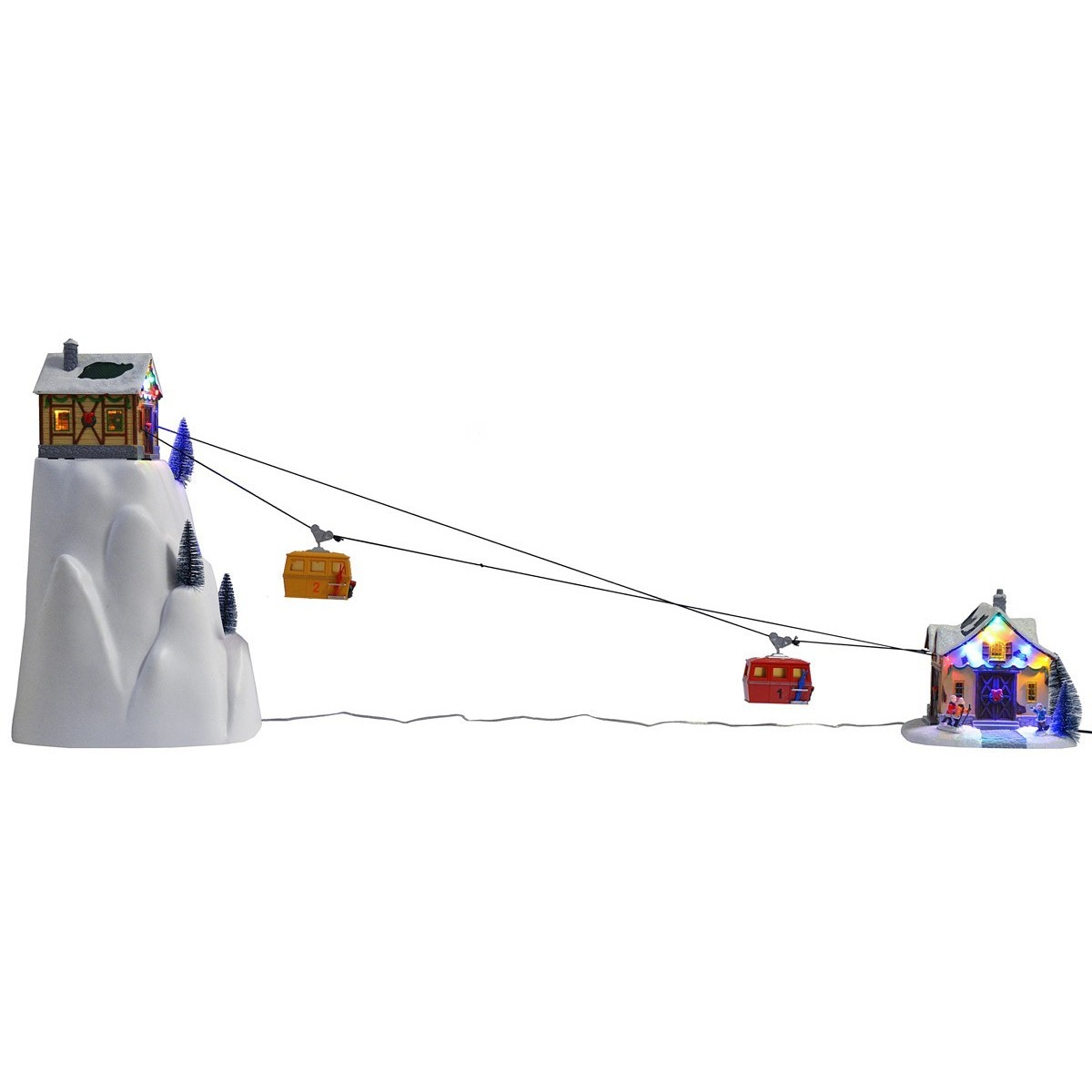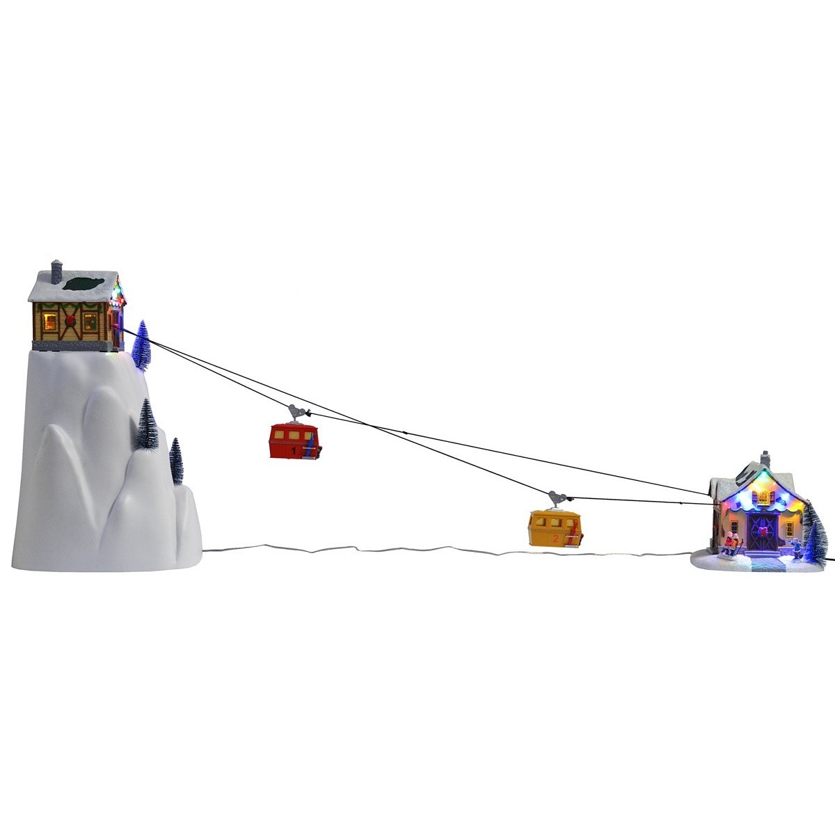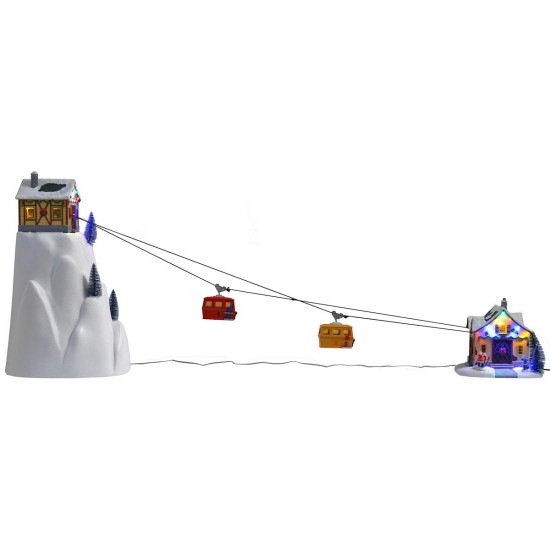 Giostrina natalizia composta da una montagna sormontata da una baita, collegata al rifugio a valle da due funivie con cabinovie in movimento. L'articolo prevede due modalità di funzionamento: possono essere attivati solo il movimento e le luci, oppure è possibile attivare sia il movimento, le luci e la musica. Il prodotto è funzionante a corrente tramite trasformatore incluso.