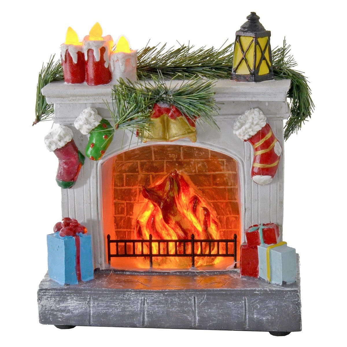 Caminetto per villaggi di natale in resina con fiamma effetto fuoco e candele tremolanti. Il prodotto è funzionante a batterie 3xAA (non incluse) con interruttore per l'accensione e lo spegnimento.