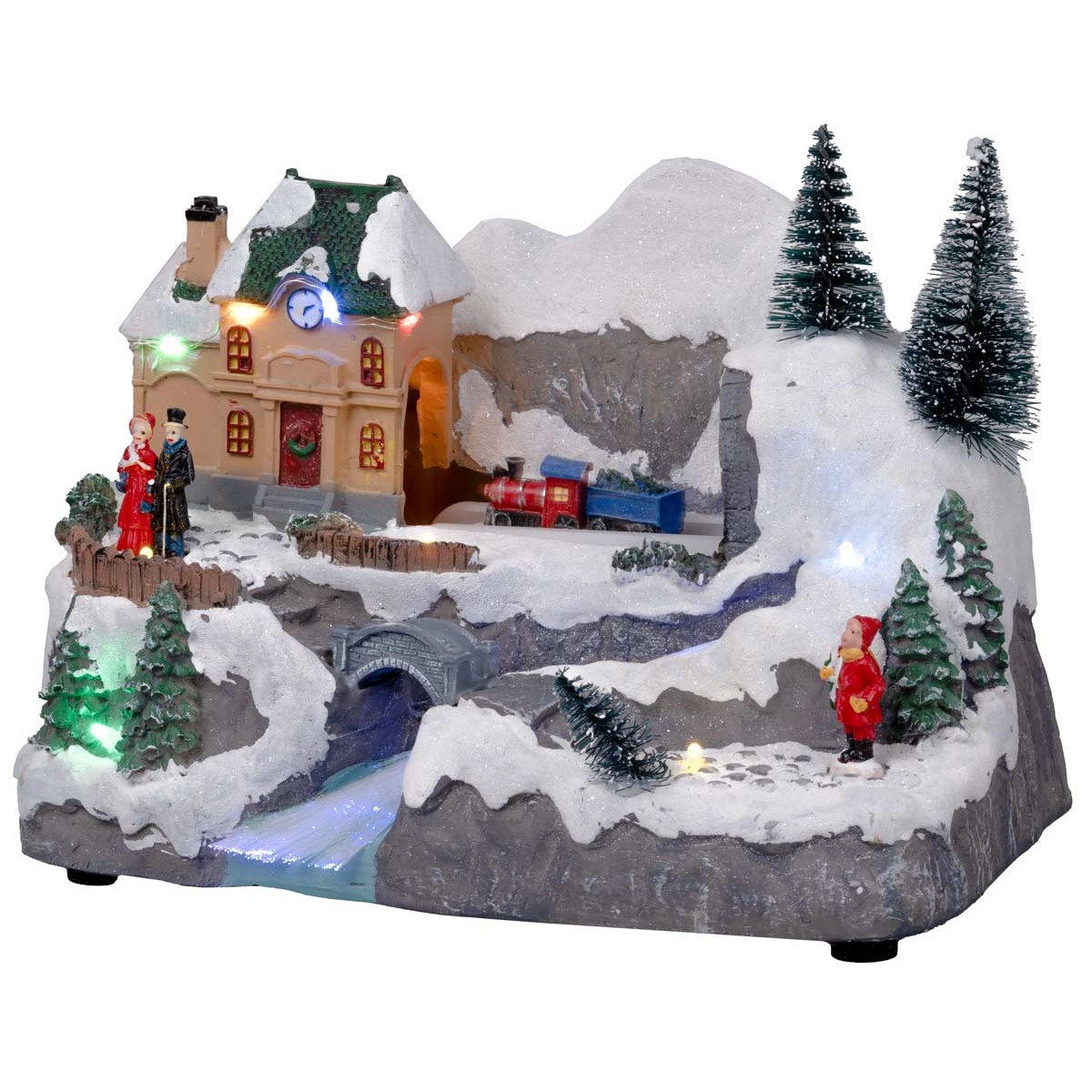 Questa giostrina natalizia, alimentata a batterie, presenta un villaggio innevato dotato di luci e musica. Nella scena si vede un treno in movimento che entra in una casa e riemerge da una grotta. Il paesaggio include un ruscello illuminato da fili luminosi, sovrastato da un ponte grigio. Ci sono anche pini innevati, una casetta ornata con decorazioni festive e varie piccole statuette. La neve, brillantinata e illuminata, aggiunge un tocco di magia alla scena, che è accompagnata da una selezione di canzoni natalizie, da quelle tradizionali a quelle meno conosciute.